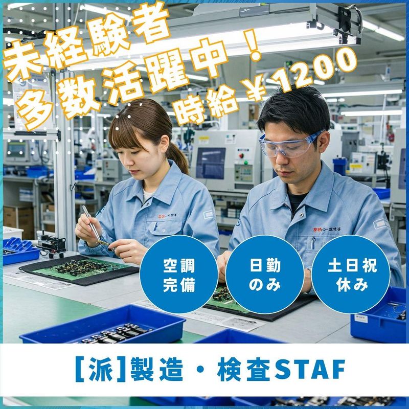 仕事内容 未経験OKのカンタン製造・検査 ―――――――――――――― ✨完全日勤のみ ✨土日祝日休み ✨空調完備◎ ―――――――――――――― 《お仕事の詳細》 ■電動ドライバーでねじ締め ■シール貼り ■機械動作の確認検査 など 住宅関連商品や セキュリティ商品の製造です。 ―――――――――――――― 《未経験でも安心!》 製造工程がマニュアル化されていて 研修体制もバッチリ! 最初は先輩が横について 丁寧に指導しますので、 未経験でも安心スタート♪ 《職場について》 ★初心者多数活躍中のお仕事です。 ★空調完備なので夏場も快適に過ごせます。 ★日勤のみ、土日祝休みなので プライベートとも両立できます。 ――――――――――――――