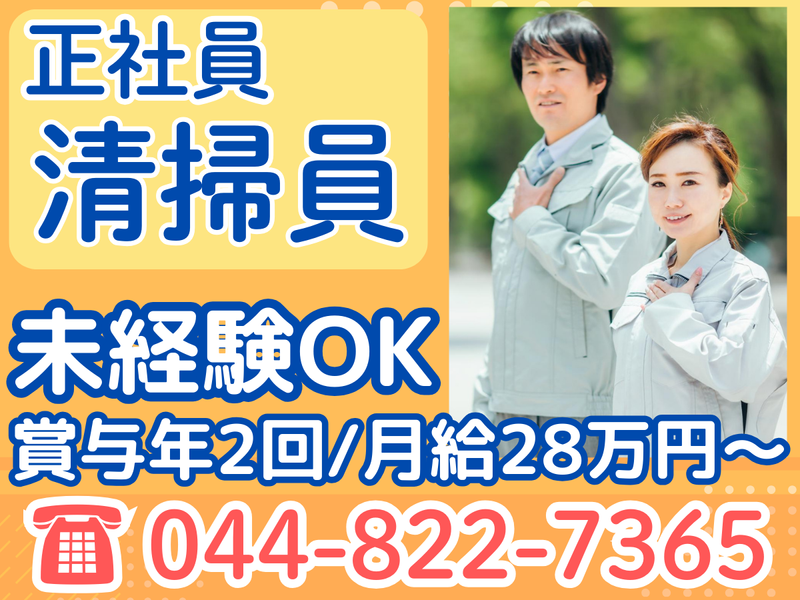 仕事内容 \ ✨オススメポイント✨ / ◆未経験者でも月給28万円!! ◆賞与年2回+昇給あり♪ ◆2~4人で作業!不明点はすぐに解決✨ ◆髪色・ピアス自由で自分らしく働ける⭐ ▼▽▼ ご応募はお気軽に ▼▽▼ TEL【044-822-7365】 担当/004まで♪  ̄ ̄ ̄ ̄ ̄ ̄ ̄ ̄ ̄ ̄ ̄ ̄ ̄ ̄ ̄ ̄ ̄ ̄ ̄ 【 仕事内容 】 建物内の定期清掃業務と日常清掃業務 <具体的には・・・> ○トイレ内の清掃 ○床の掃き掃除・モップ掛け ○備品の補充 ○ゴミの回収 など家事の延長上で活躍できるオシゴト✨ 【 現場について 】 ・主に神奈川県内の オフィスビルや病院・老人健康福祉施設等 ・清掃は基本1日1件 ・事務所に集合後、 2~4名で各現場へ向かいます! ※現場により直行直帰あり◎ 【 清掃未経験でも活躍可能 】 使用するのは基本的な清掃用具のみ。 複雑な機械操作などは行いません◎ 2~4人のチーム作業! 不明点はすぐに聞ける環境で安心✨ 【 スタッフの志望理由 】 「体を適度に動かして働きたい」 「社会とのつながりを保っておきたい」 「子育てが落ち着いたから働きたい」 「家から近いから」…など さまざまな理由で働いています♪