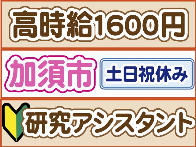 仕事内容 加須市で未経験OKの研究員の補助スタッフ 稼げる高収入案件、月収26万円以上可 「研究員の補助スタッフのポイント」 〇未経験OK(慣れるまで丁寧指導) 〇高時給1,600円スタート 〇日勤 〇土日祝休み(年間休日120日以上) 〇交通費支給(規定内) 〇ブランクOK 〇髪型髪色自由 〇車(マイカー)通勤・バイク通勤可 〇週払いOK お任せしたいお仕事は 建築用資材の研究員補助 製品開発・改良に係るアシスタント業務です 具体的には ・試作品の評価実験、その補助 ・各種実験の準備、片付け ・実験設備の点検、メンテナンス (マニュアルに従う作業) ・その他、実験に係る付帯業務 などを お願いします。 ー安心の研修制度ー サポート体制もバッチリ 安心して働ける職場環境 慣れるまで丁寧に指導いたしますので 未経験の方でも安心して働けます。 ー勤務時間ー 時間帯は8時30分~17時30分の日勤です。 時間は日勤フルタイムでしっかり稼げて 土日祝休みの完全週休2日に加えて、 GW、夏季、年末年始の大型連休ありで 年間休日120日以上とメリハリ付けて働けます 「下記のような経験も活かせます。」 ・研究・開発の勤務経験 ・データ入力、PC操作のパート・アルバイト ・測定、測量パート・アルバイト ・点検、メンテナンスのパート・アルバイト経験 正社員、パート・アルバイトとわず経験活かせます 「下記のような方にもおすすめ」 ・安定した職場で長く働きたい ・未経験でも安心して働きたい ・土日はしっかり休みたい など お仕事をお探しの方は 是非、株式会社ファーストイノベーションまで 1度ご連絡ください TEL048-522-0215 メールからの応募は24時間受付けています 電話面接も可 ↓詳細は下記URLよりご確認下さい https://entori.jp/firstinnovation 本社:熊谷市 地域密着企業なので安心して仕事ができます