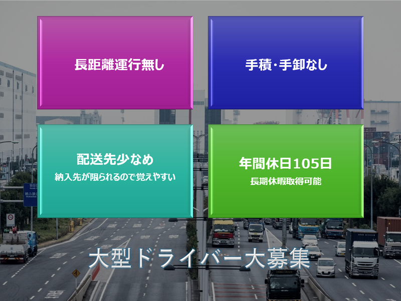 求めている人材 \ 安心・安全への意識が高い方歓迎! / 定着率抜群!学ぶ意欲がある方ならOK! 【必須】大型免許 <こんな方にオススメ> ・大型免許を活かして活躍したい方 ・身体的負担が少ない乗務員仕事をしたい方 ・休みを取りながら稼いでいきたい方 <未経験者歓迎> 免許があり、安心・安全への意識が 高い方であれば経験不問! しっかりサポートするので 安心してスタートしできる環境です! わからないことは何でも聞いてください! *異業種からの転職者も活躍中! < 経験者歓迎 > ・ドライバーの経験がある方も大歓迎です! 即戦力として活躍していただけます。 ・ブランク歓迎!ブランクOK 久しぶりのお仕事もしっかりサポート! <こんな経験も活かせます> 大型ドライバー/中型ドライバー/ 中型ドライバー/配送・配達/ルート配送/ ルート配送ドライバー/長距離ドライバー/ 軽貨物ドライバーなどトラック運転手のご経験 年齢の条件と理由:あり(例外事由1号・60歳未満(定年のため))