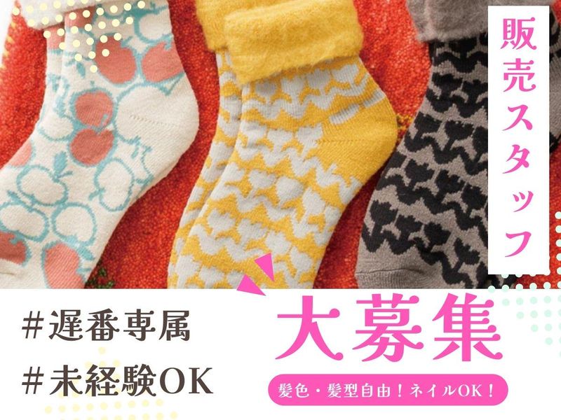 仕事内容 ■アピールポイント  ̄ ̄ ̄ ̄ ̄ ̄ ̄ ̄ ̄ ✅週2日~シフト相談OK! ✅日曜日に勤務できる方、大歓迎! ✅遅番メイン! 学生さん・Wワーク大歓迎! ✅髪色・髪型・服装自由!ネイルもOK おしゃれを楽しみながら働けます♪ ✅交通費規定支給! ✅未経験も大歓迎! ✅お得な従業員割引もあり! ✅ノルマはありません! ✅スタッフは全員 20代~40代の女性です! ✨具体的な仕事内容✨  ̄ ̄ ̄ ̄ ̄ ̄ ̄ ̄ ̄ ̄ ̄ 靴下、レギンス、タイツ、 レッグウォーマーなどのレッグアイテムや ルームウェアを扱っているお店です。 ・接客 ・レジ ・品出し などをお任せします。 ノルマはなく オシャレを楽しみながら、 好きなものに囲まれて働ける環境です* ✨未経験・ブランクも大歓迎✨  ̄ ̄ ̄ ̄ ̄ ̄ ̄ ̄ ̄ ̄ ̄ ̄ ̄ ̄ ̄ アパレル業界で働くのが 初めてという方も、 そもそも販売職が初めてという方も、 ブランクがある方も、 みなさん大歓迎! 一人ひとり活躍できるまで 丁寧にお教えするので安心してください! まずは、来店されるお客様に 笑顔で元気よく挨拶! そこからスタートしましょう♪ ✨応募のキッカケはなんでもOK✨  ̄ ̄ ̄ ̄ ̄ ̄ ̄ ̄ ̄ ̄ ̄ ̄ ̄ ̄ ̄ ̄ 「家から近い」 「授業のない日に働きたい」 「オシャレしながら働きたい」 などキッカケはなんでもOK! まずはお気軽にご応募ください♪