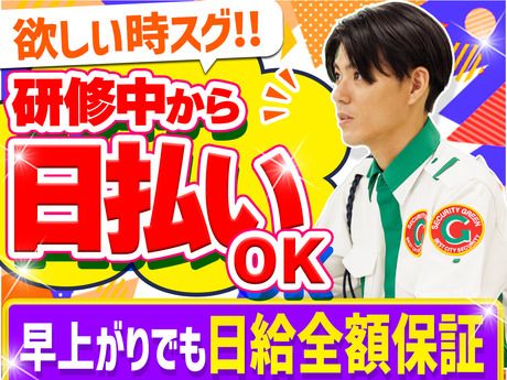 【保険制度】 雇用保険、労災保険、健康保険、厚生年金 待遇・福利厚生 【福利厚生】 【待遇・福利厚生】 ◆研修中からずっと日払いok(規定) ◆入社祝金6万円(3勤務目1万・10勤務目2万・15勤務目3万支給) ◆有給休暇あり ◆制服無料貸与 ◆毎月優秀者賞あり ◆直行直帰ok ◆研修中から交通費全額支給 ◆資格手当(指定現場以外も支給) ◆スターターキットプレゼント (リュック、地図帳、クリアファイル、 ボールペン等必要なものは無料支給) >――――――――――― 早上がりでも日給保証! ―――――――――――< 現場が早く終わった日でも、 1日分の日給を保証♪ 日によってお給料が 減ってしまうという心配も まったくありません!