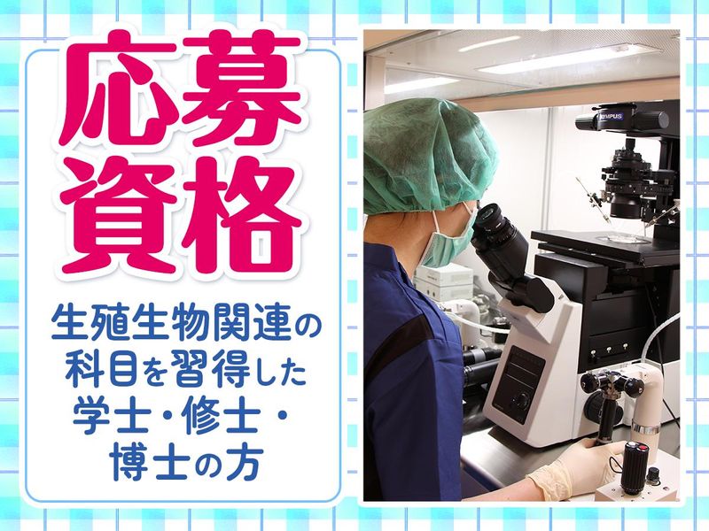 求めている人材 【必須条件】 ・生殖生物関連の科目を習得した学士・修士・博士の方 【歓迎条件】 ・臨床検査技師資格をお持ちの方 ・着任時に修士、博士の学位またはPhDがある方 ・エンブリオロジストとして経験がある方 ・胚培養士、遺伝カウンセラーの資格がある方 ・マイクロ・マニュピレーターが扱える方 ・生殖医学の知識がある方 ・遺伝学の知識がある方 ・再生医学の知識がある方 <既卒・第二新卒歓迎>