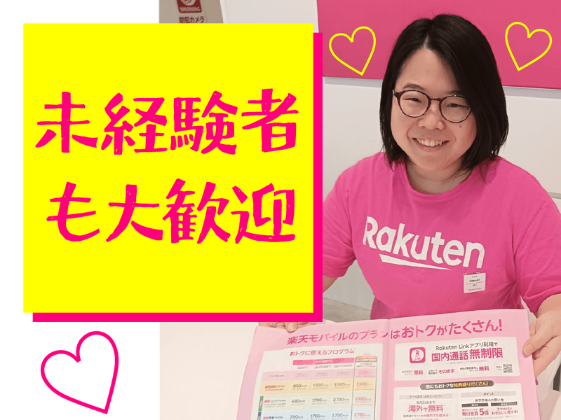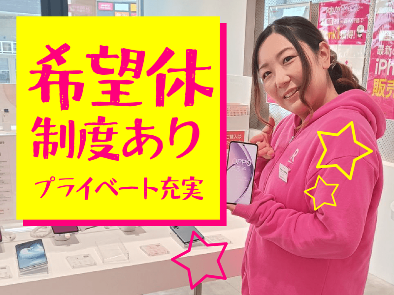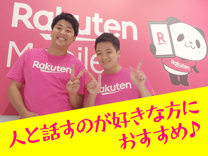 仕事内容 楽天モバイルショップでの接客対応と 契約などに関する事務作業を お願いします。 まずは、ご来店されたお客様の お話をうかがうところからスタート♪ お客様の目的に合わせて 最適なご案内・ご提案をしましょう! ◆機種変更や新規登録など サービスのご案内・受付 ◆楽天モバイルの魅力のPR など 楽天は70以上のサービスを提供しており、 スマホの料金相談だけでなく、 お客様の生活全般に 役立つ情報を提供しています。 また、増えた知識でサービスを活用し、 自分自身の生活も豊かにしていけます♪ <チームワーク抜群!> 目標に向かってすべきことを明確にし、 全員で取り組んでいます! スタッフみんなで助け合い、 困ったことがあれば、 すぐに助け合える体制です♪ 時間があるときは 一人前になるための勉強や 接客の練習をし、 忙しい時間帯は 店舗全員で接客対応をしています。 また、店舗の垣根を越えて 情報共有やコミュニケーションができる 社内システムを整備! 上司部下の距離も近く、 意見やアイデアを常に共有しています。 <キャリアプラン> 店舗スタッフとして経験を積んだのち、 店舗責任者候補として スタッフの研修やシフト管理、 プロモーションの立案など、 店舗全体を盛り上げる取り組みに 挑戦していけます! ◆店内レイアウトの企画 ◆販促キャンペーンの準備 ◆店舗独自のキャンペーンの企画 など 男女問わず、 店長として活躍しています!
