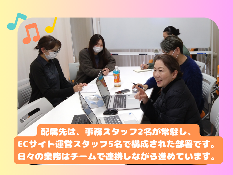 職場環境 女性事務スタッフが2名常駐しており、日々連携を取りながら業務を進めています。 また、テレワーク体制のEC運営チームとも密に協力しており、店舗とオンラインが一体となった運営体制です。 分からないことも相談しやすく、チームで支え合う環境が整っています。 喫煙所:喫煙所あり(屋外)