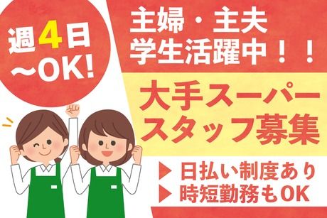 仕事内容 【お仕事詳細】 ☆───────────────☆ 未経験OK!はじめやすいレジ業務♪ 週4日~OK◎高時給1400円スタート! ☆───────────────☆ 食品や雑貨を扱う 大手スーパーマーケットで、 レジスタッフを募集します! 「接客の仕事は初めて…」 「レジって難しそう…」 そんな方もご安心ください◎ お任せするのは、 商品スキャンが中心のシンプルなレジ業務。 お会計はお客様自身で行うスタイルなので、 現金の受け渡しはほとんどありません♪ 【お仕事の流れ】 1.商品をスキャン 2.レジ袋が必要か確認 3.会計済みカゴへ移動 4.お会計方法をご案内 お会計は、 「〇番の機械でお願いします」と お伝えするだけでOK! お釣りやレシートも自動で出てくるので、 お金の渡し間違いや レシートの渡し忘れなどの心配も少なめです◎ 普段スーパーで見かける 身近なお仕事だから、 未経験の方もイメージしやすく、 スタートしやすいのもポイント♪ 地元のお客様が多く来店される 地域密着型のスーパーなので、 「思ったよりすぐ慣れた」 「楽しく働ける」という声も多数あります◎ 少しでも気になった方は、 ぜひお気軽にご応募ください! 【PRポイント】 ◇週4日~OK! 無理なく働けるから、 家庭やプライベートとの両立もしやすい♪ ◇未経験歓迎! レジは手順が決まっているので覚えやすい◎ アルバイト・パートデビューにもおすすめ! ◇自動釣銭機で安心! お金のやり取りがシンプルだから、 レジ未経験の方も始めやすい♪ ◇高時給1400円スタート! 未経験からでもしっかり収入確保◎ ◇日払い・週払いOK! 急な出費がある時も安心です♪ ※規定あり ◇勤務地相談OK! 大阪・兵庫県内に店舗多数あり! 家の近くで働きたい方もぜひご相談ください◎ ◇WEB面談実施中! 履歴書不要で応募ラクラク♪ 入社日も相談OKです! *契約について* ●採用後の転勤の有無(就業場所の変更範囲):無 ●採用後の業務内容の変更範囲:無 ※雇用契約更新の可能性:有(更新条件:契約期間満了時の業務量、労働者の勤務成績・能力・態度、会社の経営状況、従事している業務の進捗状況により判断する)