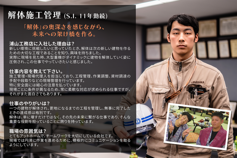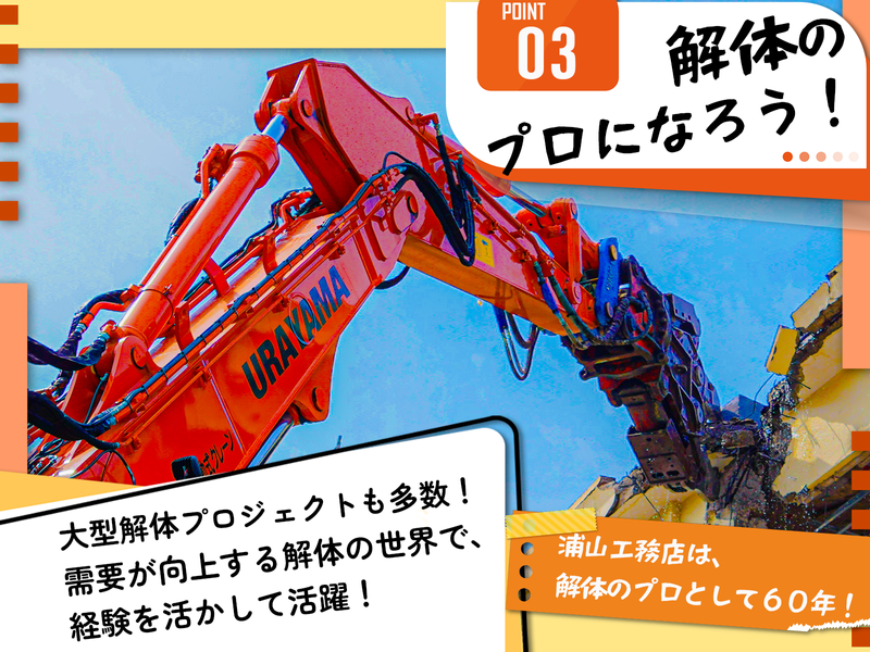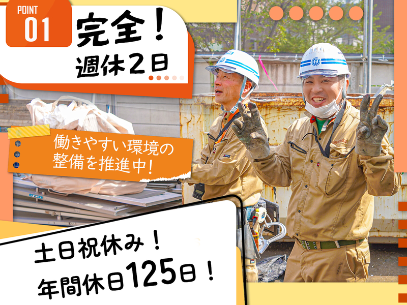 仕事内容 ■この求人の「他とは違う」3つの魅力  ̄ ̄ ̄ ̄ ̄ ̄ ̄ ̄ ̄ ̄ ̄ ̄ ̄ ̄ ̄ ̄ ̄ ̄ ✅1現場専任! 複数の現場を掛け持ちして、書類仕事に忙殺され、電話も鳴り止まない…なんてことはありません。 目の前の1現場に集中できるため、品質管理も徹底でき、残業も月平均2~5時間とほぼなしです。 ✅ 残業最小限、完全週休2日の年休125日など、働きやすさを進化中! 月平均残業は2~5時間程度。 土曜・日曜休みに加え、祝日、夏季・年末年始休暇で年間休日は125日。 無理なく長く働ける環境を整えています! ✅ 仲間と一緒に楽しみながら現場をまとめる! 「お疲れ様でーす!」と元気な声が飛び交い、笑い声が響く職場。 現場の仲間は自社の作業員と、長い付き合いの協力業者のスタッフばかりなので、 雑談や相談が自然に生まれる距離感の近さが魅力です! 施工管理としてご経験を活かしながら、仲間と一緒に丁寧な施工を目指してください! ■仕事内容  ̄ ̄ ̄ ̄ ̄ ̄ 街の風景を変える建物の解体工事が、安全かつスムーズに進むよう現場全体を管理・監督します。 同時に担当するのは1現場のみ! 複数現場を掛け持ちして手が回らない…ということはありません。 現場に常駐して各種管理をしながら、 仲間と一緒に一つの現場を丁寧に仕上げるスタイルです。 【具体的な仕事内容】 ▶ クライアントとの打ち合わせ ┗ ゼネコンや官公庁と工事内容・スケジュール・予算を調整 ▶ 施工計画の策定 ┗ 安全手順、人員・重機手配、近隣配慮を盛り込んだ計画書作成 ▶ 現場の管理・監督(四大管理) ┗ 安全管理:危険箇所のチェック、安全指示 ┗ 工程管理:計画通り進行しているか確認・調整 ┗ 品質管理:図面通り丁寧な解体ができているか確認 ┗ 原価管理:予算内で工事を完了できるよう管理 ▶ 書類作成 ┗ 施工計画書や報告書、安全書類などを事務員と協力して作成 ※一緒に働くのは自社の仲間と、長年付き合いのある協力会社のスタッフさんで、人間関係は良好です! ■職場の雰囲気  ̄ ̄ ̄ ̄ ̄ ̄ 現場からオフィスに戻ると「お疲れ様!」の声が飛び交い、オフィスは笑い声でいっぱい。 雑談や相談が自然に生まれる距離感の近さが魅力です。 社長も「最近どう?」と立ち話をするほどフランクで、相談や意見を気軽に話せる環境。 協力会社ともフレンドリーで、社員旅行に招待したり、安全大会で表彰したりと、一体感を大切にしています。 社員旅行や忘年会など会社行事も整備されています! 基本的には自由参加で、遊びたいときは遊び、休みたいときは休む文化があります! ■今後の挑戦  ̄ ̄ ̄ ̄ ̄ ̄ ・完全週休二日制の整備で、働きやすさをさらに向上(完了!) ・グループウェア導入による業務効率化 ・現場の事務所にWi-Fiを手軽に整備できる装備品(完了!) ・現場、内勤共にクラウドシフトを計画中 「安全」「効率」「人の温度」を両立させる先進的な職場を目指し、 業界の古い慣習を解体していく挑戦を続けます! ~~1日の流れ(一例)~~ 皆で集まって車で現場へ通勤 ▼朝食を食べたり雑談したり 7:30 始業、朝礼 ▼ 10時、12時、15時に休憩 ▼ 17:30 作業終了、オフィスに戻って帰宅 ~採用担当より~ 「解体」は、新しい街を作るために必ず通る道であり、誇りとやりがいを持てる仕事です。 あなたの「現場勘」と「管理能力」、ぜひ当社で活かしてください。 ご応募お待ちしています!