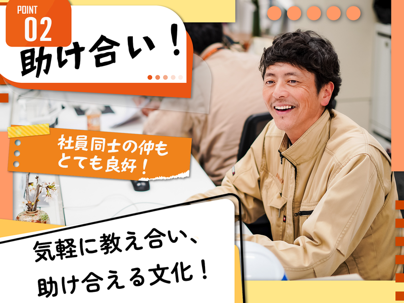 職場環境 現在7名程度の施工管理が活躍中。 年代は20~50代と幅広く、半数以上が中途採用! ★困った時に近くの先輩を頼りやすい環境 ★2022年に新設された自社ビル ★安定感抜群で定着率も高め 喫煙所:喫煙所あり(屋外) 敷地内(屋外)に喫煙スペースあり