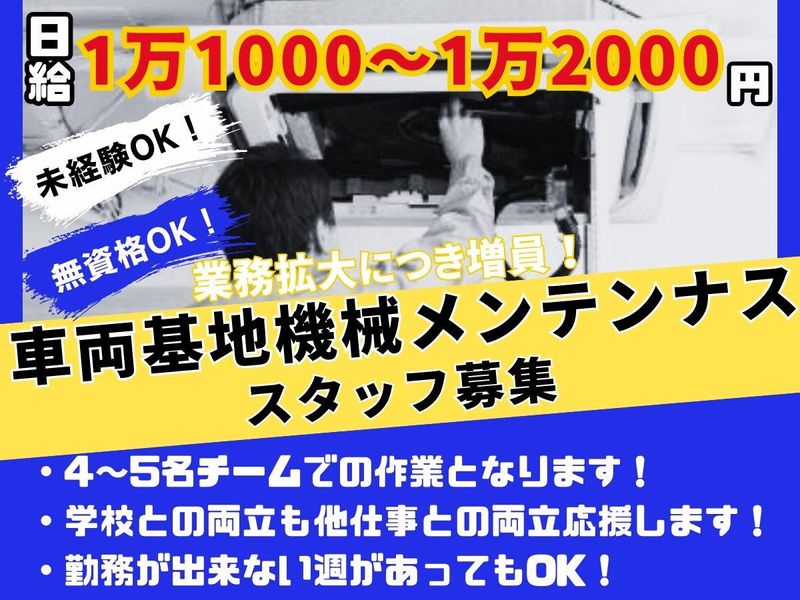 仕事内容 \未経験スタートがほとんど!チーム制で安心作業/ 車両基地や施設内での業務用エアコンのメンテナンス補助や 機械設備の点検・清掃サポートを行う仕事です。 専門作業は社員が担当するため、 あなたには【シンプルな補助作業】をお願いします。 具体的には ・業務用エアコンのフィルター交換 ・簡単な点検・洗浄のサポート ・工具や部材の受け渡し ・作業場所の片付け ・機械メンテナンスの補助作業 ✅ 難しい技術作業なし ✅ 4~5名のチーム作業 ✅ 常に先輩がそばにいます ✅ 室内作業が中心で安心 「体を動かす仕事がしたい」 「短時間で効率よく稼ぎたい」 そんな方にピッタリです。 ■■ポイント■■ ● 日給11,000円~12,000円の高日給 ● 実働5~6時間でも日給全額保証 ● 週1日~OKの自由シフト制 ● 平日のみ・土日のみOK ● 土日勤務は+1,000円支給 ● 未経験歓迎・資格不要 ● 早上がりの日も多数あり ● 残業時は1時間1,600円支給 ● 月2回給料日あり(5日・20日) ● 制服貸与(洗濯不要) ● 社員登用制度あり