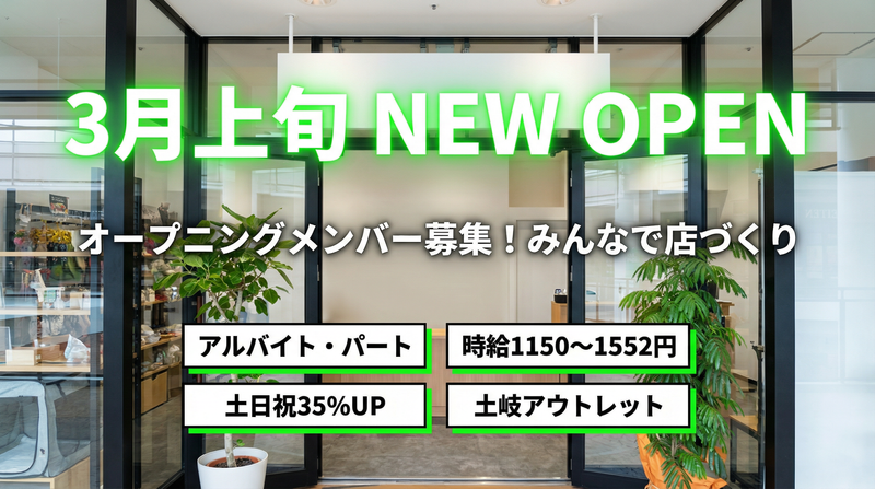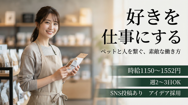 仕事内容 3月上旬オープニング募集! 自社ブランドIDOG&ICATを中心としたペット用品の店舗スタッフ☆ / ワンちゃん好きな方大歓迎♪ \ ▼ お仕事内容 ▼ 店頭での接客・販売を中心に、店舗運営に関わる幅広い業務をお任せします。 具体的には・・・ ・接客販売 ・レジ業務 ・入荷検品、品出し ・フロア内の整頓 ・店舗内レイアウト考案 ・SNS投稿(簡単な投稿) ・開店準備/閉店後締め業務 まずはできることから始めていきましょう♪ あなたのアイディアが採用されるかも? ⇒良いものは取り入れることが多い会社です! アイディアが実現する可能性も◎ 「こんな商品があったらお客様に喜んでもらえるかも!」という発想から商品企画に関わることもできます! ▼おすすめポイント▼ ✅オープニング募集 スタートラインはみんな一緒。同期スタッフと一緒に新しいお店を作り上げる楽しさがあります。 ✅ライフスタイルにあわせて柔軟なシフト 週2~3日から勤務可能なので、学校や家庭の予定と両立可能。フルタイム希望の方は1日6時間以上働けるので、しっかり収入を得られます。 ✅ 高収入のチャンス! 土日祝は通常時給の35%アップ!「週末だけ効率よく稼ぎたい」という方にもぴったりです。 ※勤務開始日は2026年3月上旬頃となります。