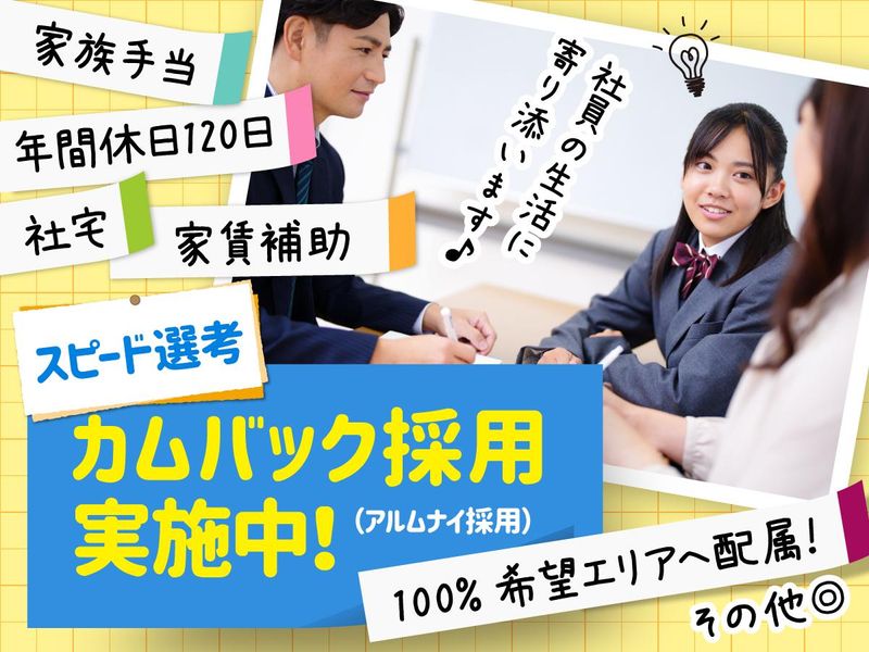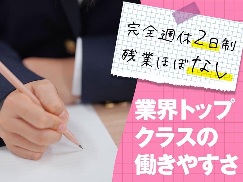 仕事内容 ★メリハリのある働きやすさ★ ◎年間で128日以上の休みが可能! 年間休日120日以上+有給取得数平均年8日 各大型連休も充実しており、メリハリを大切に働けます! ◎完全週休2日制 教室もスタッフも完全週休2日制なので、休みの日に業務が発生する心配なし! ◎基本的に定時退社 1日あたり平均15分程度と残業も少なく、効率重視の働き方ができます◎ ・・・ <主な業務内容> 小・中・高生が通う学習塾で、快適な学習環境を整えるための教室運営をサポートします。 ■生徒への対応(学習プランの作成・スケジュール管理) ■スタッフ管理(シフト管理やサポート) ■生徒や保護者との面談 ■授業、事務作業全般 <入社後の流れ> ★未経験から着実にステップアップ★ === ▼入社後1~2週間 事務作業や電話対応をメインに、先輩の仕事を見ながら少しずつ覚えていきます。 生徒の顔や名前を覚え、徐々に生徒との距離を縮めていきましょう! ▼1~2ヵ月 事務作業に慣れてきたら、スタッフのシフト管理や授業の見回りにも挑戦! 仕事の幅を広げていきます。 ▼3~6ヵ月 生徒と信頼関係を築き、進路相談や面談を少しずつ担当! 実践的な経験を積んでいきます。 === 【教育業界で新しいキャリアを】 「未経験だけど教育に興味がある」「人と関わる仕事がしたい」 そんなあなたにピッタリ! 特別な経験や資格は一切不要です◎ 入社後の研修制度やサポート体制が整っており、他業界から転職した先輩たちも活躍中。 将来的に教員を目指したい方、教育関連で独立したい方など、2~3年後を見据えた方もスキルを磨いていける環境です! \研修制度が充実/ 入社後は専属の教育担当がついて丁寧にサポート。 分からないことがあれば、いつでもご相談ください! \スキル&キャリアアップも応援!/ 社外研修の参加費用や業務に関わる資格取得費用は80%~100%を会社が負担! また、結果だけに限らず、プロセスを含めて頑張りをしっかり評価するのも当社の特徴です。 【サクラサクセスって?】 山陰、関西、九州、東海エリアで個別指導塾を展開しています。 大手塾が進出していない地域に注目し、独自のビジネスモデルで事業を展開。 創業から15年で、60校までに成長しました。 ★地域貢献を実感できる★ サクラサクセスは、小学生から高校生を対象にした個別指導塾。 マンツーマンや少人数制、映像授業、速読講座など、生徒に合わせた多様な指導方法を提供しており、地域に根ざした塾でやりがいを感じながら働けます!