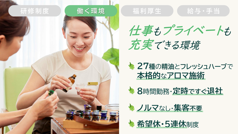 仕事内容 ◆業界大手ならではの 充実した福利厚生! ____________________ ✔研修が充実しているので 未経験の方も安心 ✔予約制だから残業ほぼなし! ※希望休の取得可能♪ ✔年に一度、5連続休暇制度あり ✔産前産後休暇や育児休暇など 福利厚生充実 ✔転居費用・住宅補助 ※規定あり ✔スキルアップを応援 ※資格取得援助金あり ✔社員割引あり ※dejavuやOPERA等 ピアスグループ製品の割引 ✔会員制サービス ※会員制リゾートホテル利用可能 <仕事内容> 「カオン」は植物の香りと ハーブの恵みを大切にした、 生ハーブとアロマセラピーの 専門店です。 お客さまのお悩みをアロマオイルの カスタマイズブレンドや独自技術を用いて 解決に寄り添います。 フレッシュハーブとアロマオイルの 組み合わせによって、 他社では体感できない経験を提供し、 本来の自分と心身の健康を 取り戻していただきます。 <主な業務の流れ> 1、カウンセリング 2、フレッシュバス 3、施術 4、アフターケア <研修が充実> ____________________ 入社するスタッフの多くが未経験スタート。 初心者の方でもしっかり仕事の流れや 技術を身につけていただけるよう 丁寧に指導いたします。 デビュー後もスキルアップ研修を ご用意していますので、ご安心ください。 <福利厚生も充実> 産前産後休暇や育児休暇制度 (取得実績あり) 時短勤務制度など、 ママになっても活躍できる環境です! 休日もしっかり取れるので、 ライフスタイルに合わせて 仕事とプライベートを両立しながら 働いていただけます。 <働きながらキレイになれる> カオンでは技術・接遇・ハーブや アロマセラピーなどの研修制度が充実しており、 美容や健康に関しての知識が増えます。 また、COVERMARKやdejavu、OPERAなど ピアスグループ製品も社員割引で ご利用できますので、 働きながら自分磨きができます。
