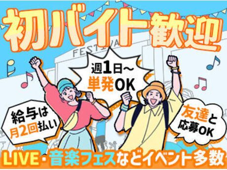 求人詳細 イベント会場の設営撤去スタッフ(アルバイト・パート)/登録制!<バイトデビュー大歓迎!>ステージを支える裏方のヒーローに!!単発OK! 【給与】 時給1300円~2100円 ※別途交通費 【シフト】 週1日以上、1日3時間以上 【勤務地】 所沢市 【最寄り駅】 チームで協力してステージを作り上げるので、未経験でも安心! 憧れの有名アーティストやアイドルのLIVEを支えるスタッフとして、 縁の下の力持ちになりませんか? 楽しく働きながら、たくさんの仲間たちと最高のLIVEを作り上げるチャンス! 【設営・撤去STAFFの採用を強化中!】 ステージ設営・撤去STAFFは、 お客様、アーティストが安心して過ごせるよう コンサート開催の基礎となる縁の下の力持ちです! アーティストだけが立てる壮大なステージを作り上げた達成感は、 お仕事の醍醐味でもあります。 体を動かすのが好きな人、 がっつり稼ぎたい方にもおすすめ! 《注目ポイント》 なんと!!<時給1300円以上> 1勤務だけで日給1万7000円以上!!! サクッとGETできちゃいます。 「単発で試しに1回だけ」 「月○万円くらい稼ぎたい!!」 そんな働き方も大大大歓迎です! 友達を誘って一緒に勤務ももちろんOKです! 試用期間詳細 試用期間なし 勤務期間 短期・単発(1日)/短期(1週間以内)/短期(1ヶ月以内)/短期(3ヶ月以内)/長期(3ヶ月以上)/春/夏/冬休み期間 勤務形態 シフト制 特徴・メリット 体を動かす仕事/大量募集(10名以上)/すぐ働ける 待遇・福利厚生(備考) ・面接時、履歴書と証明写真不要! ・給与は月2回の銀行振り込み ・交通費支給(当社規定内) ・紹介手当あり ・特別手当あり ・社員登用制度あり ・業界就職制度あり ・深夜時給25%UP! ・残業代支給 ・お弁当支給 ・直行直帰OK(現場によっては乗り合わせでの移動もあり) 勤務期間もシフトも自由自在 □友達と一緒に楽しみたい! □このイベント楽しそう! □週末だけ副業で働きたい! □とにかく稼ぎたい!!レギュラーワーク!etc. 1日だけの【単発】も 【レギュラー勤務】も みなさん大歓迎! 一度登録さえしてしまえば ≪自分が働けるときだけ…≫ 自分でシフトを決められる! 応募後のプロセス エントリー後弊社からご連絡差し上げます。 応募先電話番号 0120-616-455