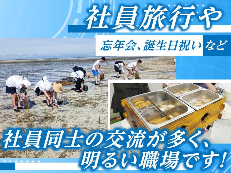 職場環境 #20代・30代・40代男女活躍中 社員旅⾏や忘年会、誕⽣⽇祝いなど、 談笑や美味しいものを楽しむ集まりがあり 社員同士の交流が多く 明るい雰囲気の職場です。 役職や年齢にとらわれない⾵通しの良さが 働きやすさに繋がっています。 喫煙所:喫煙所あり(屋外)