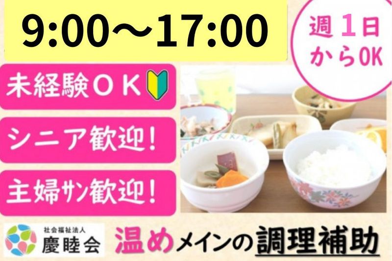 【アピールポイント】 基本は、温めるだけの簡単な調理補助! ★資格なくてもOK! ★扶養内勤務OK! ★50代・60代・70代活躍中!
