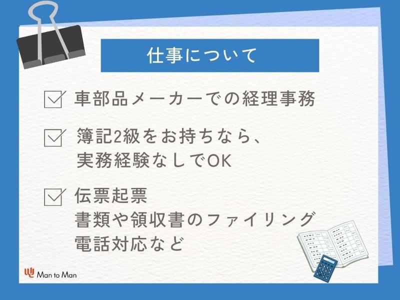 求める人材: 【応募資格】 【必須】:日商簿記2級以上 (実務経験なしの方も活躍中!) 【尚可】:経理経験3年以上 ※経験者の場合:スキルにより、 チェック業務(伝票と証憑とのチェック)も お任せ。 ーーーーーーーーーーーーーーーーーーー 派遣先には、未経験からスタートした 方もたくさんいます! 【Man to Manでは他にも以下の様な スタッフさんが活躍されています】 ・事務のお仕事に興味がある方 ・学歴不問の職場で働きたい方。 ・春日井市、小牧市付近で働きたい方 ーーーーーーーーーーーーーーーーーーーー Man to Manには、ハローワークや一般求人誌 には掲載されていないお仕事情報も たくさんありますので、まずはお気軽に お問合せください。
