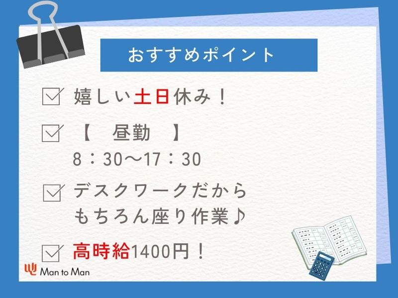 固定時間制 勤務時間・曜日: 【勤務時間】 【 昼勤 】 8:30~17:30 休憩12:00~12:45 残業はほぼ無し! 多くて:月10時間程度です。 【期間】 3ヵ月以上~ ※場合によっては延長の可能性もあり