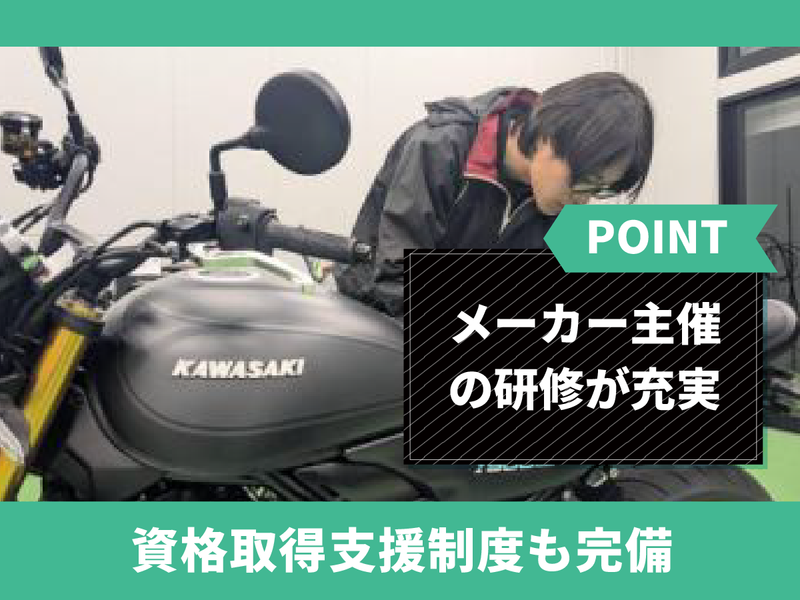 求めている人材 <経験者活躍中> *経験者歓迎・復職希望者歓迎・ブランク歓迎 【必須】 ※自動車整備士資格(3級以上、二輪または四輪) ※普通自動車運転免許(AT限定可能) ※高卒以上の学歴をお持ちの方 【歓迎】 ・大型自動二輪車免許をお持ちの方、または取得意欲のある方 ・整備士としてのブランクがある方や、復職を希望される方 ・Kawasakiが好きという情熱をお持ちの方 ・周囲とのコミュニケーションを大切にし、誠実に対応できる方 ・整備士としての技術向上に飽くなき探究心を持っている方 ・プライベートと仕事を両立させ、長く安定して働きたい方 <採用担当からのメッセージ> 「バイクが好きという純粋な気持ちを、仕事のやりがいに変えてみませんか。お客様に心から喜んでいただける整備を提供するためには、スタッフ自身の充実が不可欠だと考えています。新しく生まれ変わる店舗で、私たちと一緒にKawasakiの魅力を広めていきましょう。あなたの技術と情熱を、最高の形でお客様へ届けてください。」