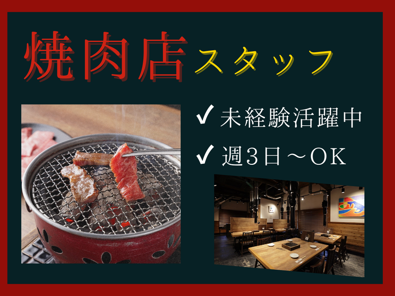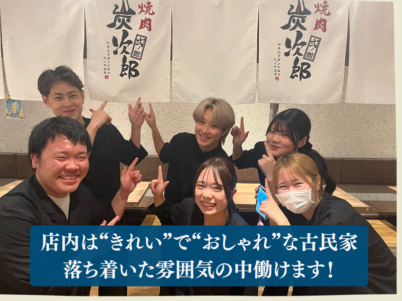仕事内容 ◇・◇・◇・◇・◇・◇・◇・◇・◇・◇・◇・◇・◇ 春の卒業シーズンに伴い、新しい仲間を募集✨ 昨年12月にオープンしたキレイなお店で 働けますよ*。٩(ˊᗜˋ*)و*。 ◇・◇・◇・◇・◇・◇・◇・◇・◇・◇・◇・◇・◇ \ 働きやすさバツグン! / ”キレイ” ”おしゃれ” なお店で 働きたい方におすすめのアルバイト!✨ 炭火と黒毛和牛が売りの”焼肉炭次郎” 系列店の ”焼肉炭次郎 弍ノ館” が スタッフが何名か卒業の為、 【アルバイト・パート】さんを 2~3名募集いたします♪ 高校生大歓迎です! 。・*。・*<当店のPOINT>。・*。・* ✅週3日~勤務可能 ✅2週間ごとの自己申告シフト制 ✅派手すぎなければ髪色もネイルもok! 。・*。・*。・*。・*。・*。・*。 。・*。・*<お仕事内容>。・*。・* ・ 焼肉店でのホール業務をお任せします♡。・ ✅お客様のご案内 ✅配膳 ✅簡単な清掃 など ※モバイルオーダー制のため、 オーダーの受付はほぼなく 負担が少ないです◎ 。・*。・*。・*。・*。・*。・*。 未経験の方でも丁寧に指導しますので、 安心してご応募ください♪。・ 土日のどちらか入れる方歓迎! 近隣にお住まいの学生さん大歓迎!✨ 既存店では学生さんが多数活躍しているので、 仲の良いお友達も出来ちゃうかも!? * シフトなどもお気軽に相談してくださいね!