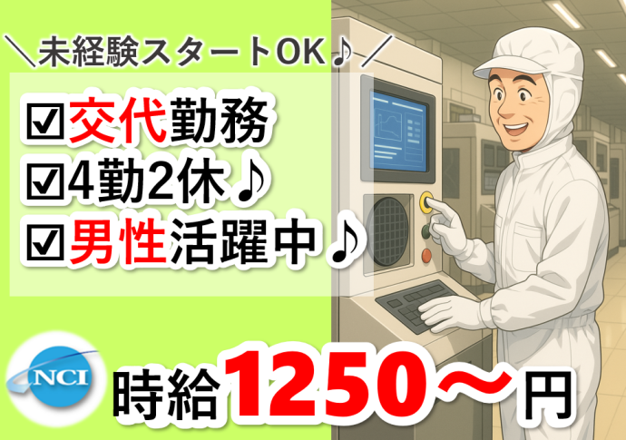 PR・職場情報 =====ここがポイント===== ■未経験で出来るオペレーターのお仕事! ■きれいな工場でのお仕事! ■20代~50代の方が多く活躍中! ==================== ◇NCIのここがオススメ!◇ ▼社会保険にすぐ入れる!▼ 入社日当日から加入できます♪ ▼サポートバツグン!▼ 一人ひとりのスタッフさんに 担当営業が付いて 就業を全力でサポート! ▼ほかにもたくさんの求人あり!▼ 実際にお話を聞いてみて 「何か違うな・・・」と 思うところがあれば 別のお仕事のご紹介も可能です! まずはお気軽にお電話 or フォームから ご応募ください♪ 求人の特徴 ■■■お仕事ポイント■■■ ≪工場、製造、オペレーターの お仕事をお探しの方オススメ≫ 〇PCやスマホに使われる 電子基板を製造する工場において 未経験でも活躍できるお仕事です! 〇PC・スマホに使用される 電子基板に対して マシンを用いて 切断・計測・加工を行う カンタンもくもく作業! 〇基本的には マシンのボタンを操作するだけ! 作業自体は単純なものなので 資格も経験も一切必要なし! どなたでも活躍できる モクモク作業なんですよ!! 〇ライン作業ではありませんので 焦って作業を することはありません! 〇休日は土日休みなので 自分の時間をしっかり確保しながら お仕事することができちゃいます! 〇就業してからも当社営業スタッフが しっかりフォローしますので 派遣が初めての方や 未経験のお仕事に不安のある方も 安心してお勤めいただけます!! ===こんな方にオススメ=== ■経験がなくてもやれる作業希望! ■工場で働きたい! ■製造の経験を活かしたい! =================== 20代~50代の方が多く活躍中! お仕事についてのお問合せだけでも お気軽にどうぞ!! 【お仕事開始までの流れ】 1、まずはお気軽に下記応募フォームからご応募ください! 2、採用担当より追ってご連絡をいたしますので面談日時を調整します! 3、スタッフ登録を兼ねた面談と職場見学を行います! 4、入社が決まったら弊社事務所にて入社手続きを行います! 5、お仕事スタート!! ※平日18時以降の面談やオンライン対応も可能です。 ご希望の方は遠慮なくお問い合わせください! ご不明点等ございましたらお気軽にお問合せくださいませ。 - この求人以外に派遣・バイト・アルバイト・パートや軽作業、製造、事務のお仕事に興味のある方、短時間、短期・長期歓迎です。 白河市、西白河郡、東白川郡、石川郡、岩瀬郡、栃木那須エリアでお仕事をお探しの方、未経験、ハローワークでお探しの方もお問い合わせください。 - 〒961-0908 福島県白河市大手町12-1 駅前田部井ビル2階 株式会社 NCI 白河支店 電話番号:0120-744-555 (※お電話にてご応募の際は「求人サイトを見て」とお伝えください!) 一般労働者派遣事業許可番号:派07-300732 職業紹介事業許可番号:07-ユ-300310 求人ポイント シニア応援,社員登用あり,交通費支給,即日勤務OK,急募,主婦・主夫歓迎,長期,フリーター歓迎,バイク通勤OK,給料前払いOK,大量募集,学歴不問,車通勤OK,残業月20時間以内,転勤なし,未経験者歓迎,経験者歓迎,リモート面接OK,研修あり,社会保険完備,制服貸与,50代以上応募可,ブランクOK,育休制度あり,U・Iターン歓迎,家庭都合休OK,禁煙・分煙,長期休暇あり,40代以上応募可,第二新卒歓迎,履歴書不要,産休制度あり,友達と応募OK,留学生活躍中,週5からOK,産休・育休取得実績あり,変形労働時間制,固定時間制