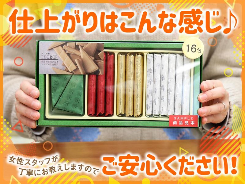 仕事内容 <店舗に設置するための見本製作!> ★未経験から始められるモノづくりのお仕事 ★基本は座り作業♪工作が好きな方にも◎ ★土日祝ほぼ休み!プライベートも充実☆ ★髪色・服装自由*オシャレしたままでOK! 長く親しまれている菓子メーカー本高砂屋で 店頭に飾る商品見本の製作をお任せします。 <具体的には> ・見本商品の組立 ・商品POPのカット ・清掃 ・作った見本を仕分け、箱詰めして物流へ ★未経験スタートOK! 切って貼ってのカンタン作業♪ すでに出来上がったデザインに合わせて、型に沿って切ったり貼り付けたりするだけ! 道具も一度は使ったことがあるような馴染みあるものなので、特別なスキルがなくてもすぐに慣れていただけます◎ 必要なノウハウは実務を通してゆっくり丁寧に教えていきます。 自分の手でモノが出来上がっていく楽しさを感じられるお仕事です。 難しい作業はないのでバイトデビューにも◎ 未経験のからでも始められるようしっかりサポートするので、安心して飛び込んできてください☆ ★こんな職場です◎ 和・洋菓子の製造や販売を行う本高砂屋。 現在はパートスタッフさんが40~50代の女性3名。 少人数なので声をかけやすく、初めてでもすぐに打ち解けられる環境です。 作業中はおしゃべりを楽しみながら進めていて、明るくにぎやかな雰囲気です♪ 先輩スタッフは気さくで頼りになる人ばかりで、わからないことも聞きやすく、安心して働けます。 また、ライン作業ではないため、落ち着いて作業に取り組めますよ! 気になった方は、ぜひお気軽にお問い合わせください。