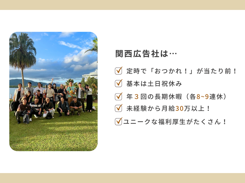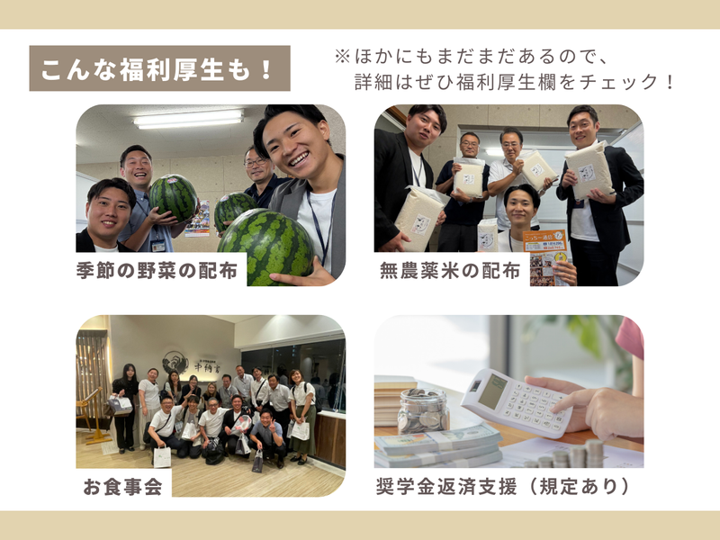 【保険制度】 雇用保険、労災保険、健康保険、厚生年金 待遇・福利厚生 【福利厚生】 ・各種社会保険完備 ・賞与は年3回!(4月・8月・12月) ・各種報奨金/インセンティブあり ・奨学金返済支援制度あり(規定による) ・社用車貸与(通勤もOK)・社用携帯・タブレット貸与 ・営業に必要なツールはすべて会社が用意します! ・研修旅行あり(国内・海外) ・充実の教育・研修制度でスキルアップもサポート ・個人や営業所ごとの表彰制度あり ・直行直帰OK! ・ベネフィット・ステーション導入 Netflixや飲食店、映画館、ホテル、スポーツジムなど、 会員限定の優待価格で利用できます ・健康経営優良法人2025 認定企業! ■ちょっと変わった⁉面白すぎる福利厚生 ┈┈┈┈┈┈┈┈┈┈┈┈┈┈┈┈•• 「そんな制度あるの!?」 と社員も驚くような、 ちょっとユニークで、 ちょっと嬉しい制度がいっぱい✨ ✨お子さんや家族も一緒に楽しめるイベント! 当社では、従業員だけでなく、 その家族も大切にしています。 春には「関西広告社祭」、 秋には「収穫祭」といったイベントを開催! 子どもも大人もワクワクできる 景品が盛りだくさんの大抽選会や、 家族で楽しめる催しで、 日頃の感謝を伝え合う場となっています。 ✨毎月1~3kgのお米を配布! 自社で育てたこだわりの 無農薬・天日干し「幸穀米」を 毎月全社員にプレゼント! ✨季節のお楽しみ便も! 無農薬野菜や旬の果物など、 季節のお楽しみ便も毎月届き、 社員から大好評! ✨誕生日はちょっと特別な1日に 毎月、誕生日月の社員で食事会&観劇を開催。 みんなで「おめでとう」を伝え合う 温かい文化があります。 ✨好きな本の購入を会社が支援! ジャンルは自由。 ビジネス書からレシピ本、雑誌、絵本まで◎ ✨健康管理をゲーム感覚で楽しく! BMIが標準値なら…なんと賞金支給! BMIが標準値なら賞金も♪ 健康ダイアリー制度で無理なく健康意識アップ。