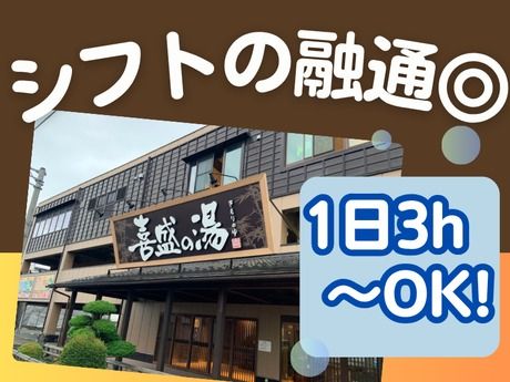 その他 未経験OK、大学生歓迎、フリーター歓迎、主婦・主夫歓迎、短時間OK、長期歓迎、土日祝のみOK、週1、2日からOK、週3日以内OK、シフト制、昇給あり、交通費支給、社員登用あり、制服あり、車・バイク通勤OK 【ブランド名】 喜盛の湯 【事業内容】 天然温泉「喜盛の湯」の運営