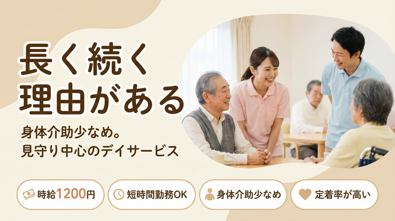 求めている人材 【こんな方に向いてます】 当てはまったらぜひご応募ください! ✅ 落ち着いた環境で長く働きたい方 ✅ 利用者さんとのコミュニケーションが好きな方 ✅ デイサービスでの経験を活かしたい方 【必須条件】 ・介護職の実務経験(デイサービス経験者歓迎) ・明るく丁寧な対応ができる方 ・チームで協力できる方 【歓迎条件】 ・初任者研修、実務者研修、介護福祉士 ・ブランクがある方 ・家庭と両立しながら働きたい方