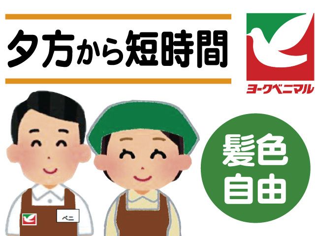 仕事内容 ヨークベニマル御幸ヶ原店 加工食品部門スタッフ募集! お仕事開始日応相談!夕方、週3~4日の勤務です! 土・日・祝日・繁忙期出来る方歓迎! 20代、30代、40代、50代の主婦(夫)、 主婦パートさん(主夫パート)、 扶養範囲内、フリーターさん、学生さん、 若い世代も多数活躍中! Wワークや副業の方もOK! お子さまの学校行事やご家庭の都合なども スタッフ皆で協力しながら調整しております 家庭との両立もできる職場です! (加工食品部門のおしごとについて) 〇アルバイトスタッフ 乾物、調味料、カップラーメン、飲料、菓子などの 商品補充・陳列を担当いただきます。 商品の種類や場所も働く中で自然に覚えられるのでご安心ください。 ・髪色自由! 働くうえで染め直しの必要もありません! あなたらしいスタイルで働けます! ※安全・衛生面の観点で一定のルールあり。 ・研修制度あり 未経験でもしっかりサポートいたします! ・マイカー/車通勤可 自転車や公共交通機関での通勤もOK! (応募方法について) WEB応募よりエントリーください 24時間受付中です WEB応募後は追って面接日をご案内いたします。 お電話でのお仕事内容や、 採用に関するお問い合わせもお気軽に! TEL.0120-889-409