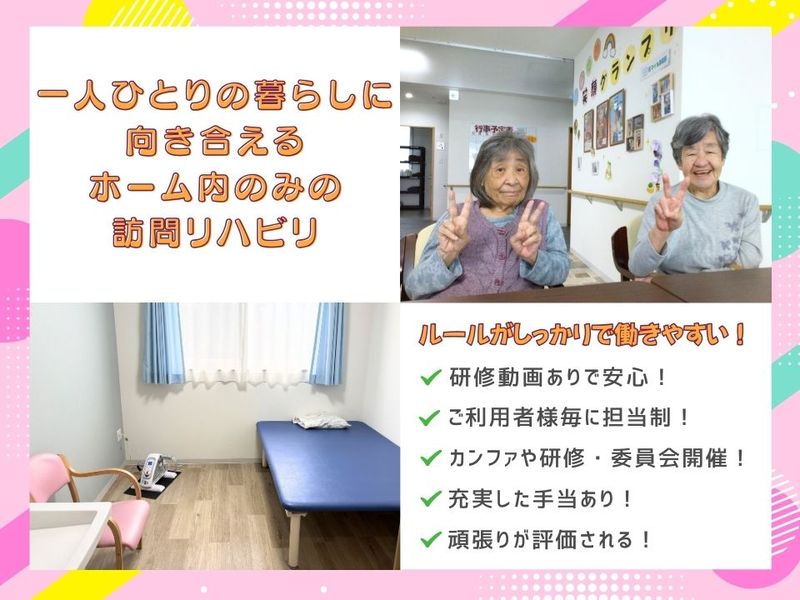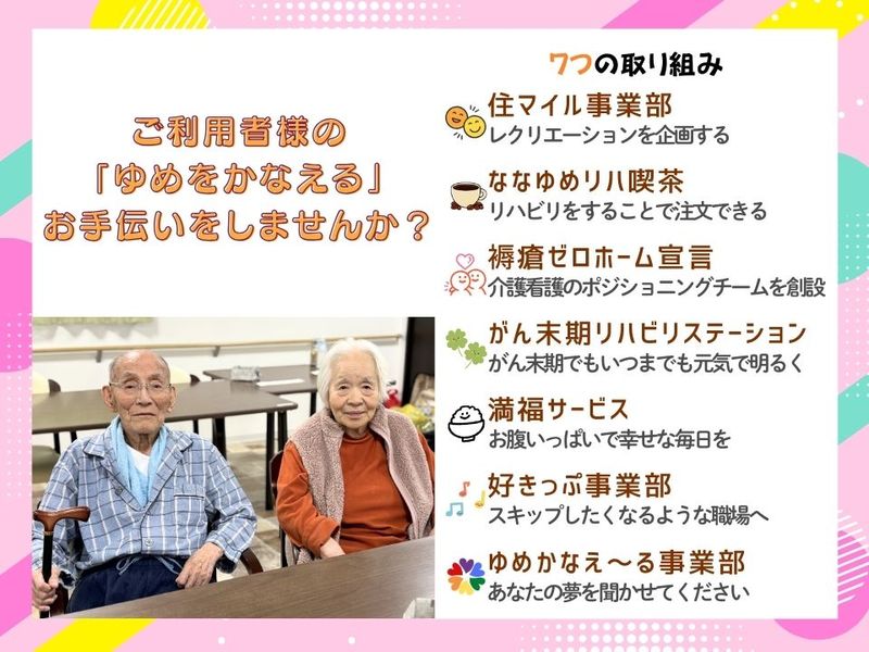アピールポイント: ⌒⌒⌒⌒⌒⌒⌒⌒⌒⌒⌒⌒⌒⌒⌒⌒⌒⌒⌒ 「住み慣れたご自宅で、 夢のある暮らしをいつまでも」 の理念をもとに、 ご利用者様一人ひとりの 「ゆめをかなえる(Yell)」 ケアや取り組みを大切にしています。 ⌒⌒⌒⌒⌒⌒⌒⌒⌒⌒⌒⌒⌒⌒⌒⌒⌒⌒⌒ 「最期まで好きなことを続けたい」 「家族と過ごしたい」など 利用者様の想いに寄り添い、 その人らしい暮らしをかなえる仕事です✨ ▼「かなえて」きた「ゆめ」▼ ★入館時間に制限無く家族に会える ☆コロナ渦でも看取りは家族と一緒がいい ★胃ろうでも嚥下訓練を行って食べれるものは食べたい ☆リハビリを頑張って家族と外食や結婚式に参加したい ★訪問デパートで好きなものを買っておやつを食べたい 等 ▲ななゆめは縟瘡ゼロ宣言ホーム▲ ご利用者様に縟瘡は絶対につくりません!! 多職種連携したポジショニングチームで徹底的に管理 3ケ月に1度は縟瘡チェックを行い皮膚状態を観察し評価 チームプレイで縟瘡に立ち向かいます!!
