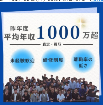 年俸5,000,000円~12,000,000円 給与詳細 基本給:年俸 500万円 〜 1200万円 固定残業代:なし 【一律手当】 全員に一律で支払われる通勤・皆勤・家族手当金額:なし 全員に一律で支払われるその他手当金額:なし 弊社では3か月ごとに実績上位20名を対象に、プチボーナスとして歩合歓迎制度を導入しております。 ✅月給30万円~50万円+歩合 ✅歩合による3か月ごとのボーナス支給(個人実績による) 【毎月のインセンティブ】 ・個人達成 ・チーム達成 ・全体達成 【給与例】 給与例 \年収例/ 【1800万円】 ・査定スタッフ(入社4年目・35歳) ・月給35万円+歩合 【1500万円】 ・査定スタッフ(入社2年目・30歳) ・月給30万円+歩合 【800万円】 ・査定スタッフ(入社1年目・25歳) ・月給30万円+歩合
