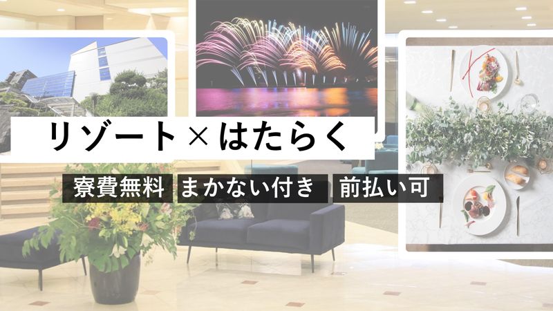 仕事内容 \\住み込みリゾートで働きませんか?// 大人気のリゾートバイト♪住み込みなのでお金もがっぽり貯まる♪ 準備するものは働く意欲だけ!出会いもたくさん!経験もたくさん! \メリットたくさん/ ・寮費無料 ・賄い無料 ・個室寮 ・お休みの日は観光地めぐり 熱海の大人気ホテルでレストランサービススタッフのお仕事です。 オーシャンビュー♪冬休み稼ぎたいあなたにぴったり! リゾートバイトならではの貴重な経験をしてみませんか? ★お仕事内容★ ・お客様をレストラン席までご案内 ・料理の配膳下膳 ・テーブルセッティング、片付け ・レストラン内清掃 など - 難しいお仕事はありません!初めてのリゾートバイトでも安心♪ ベテランのスタッフさんもいますので、しっかりサポートします◎