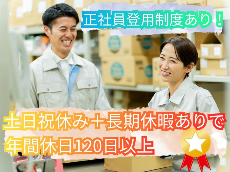 仕事内容 ◆-◆ 未経験から月収21万円以上可! 日勤のみ&土日祝休み♪ 20代~40代男女活躍中◎ ◆-◆ 倉庫内で製品の梱包・出荷業務をお任せ♪ 難しい作業や手順は一切なし! 適度に体を動かしながら働けるので 気付いたら定時だ!なんてことも(笑) 入社後は慣れるまでしっかりと先輩スタッフがフォローするので 現場作業、倉庫作業が初めてという方も安心して働ける環境を 整えています◎ 現在20代~40代の男女が活躍中♪ 将来的には正社員登用制度もあるので 未経験からキャリアUPの道もしっかりとあります。 お仕事は日勤のみ&土日祝休みで自分の予定も立てやすい♪ 長期休暇で旅行に行くも良し!家でゆっくり過ごすも良し! プライベート時間もしっかりと確保できます。 少しでも気になる方は職場見学も大歓迎♪ 作業の流れ、職場の雰囲気をしっかりと確認してから働けます。 まずはお気軽にご応募ください◎
