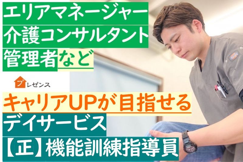 【仕事内容】 介護業界未経験の方も歓迎!ブランクある方も歓迎! 新規出店や新規事業・コンサル事業など今後更に事業を拡大していきます。 将来、管理者やマネージャー・介護コンサルタント・独立を目指せるリハビリデイサービスのリハビリ職募集! 【具体的な仕事内容】 リハビリを中心とした定員10名の地域密着型通所介護での機能訓練指導員業務および施設運営管理サポート業務 ・個別機能訓練、集団機能訓練の実施 ・計画書の作成(パソコン使用) ・モニタリングの実施 ・送迎業務 など ●施設の特徴 リハビリは、食事の準備・片付け、掃除、歩行訓練などの日常動作をメインにサービス提供しています。 業務上の入力作業はiPadを使用して手書き作業の負担を軽減しています。 【プレゼンスについて】 ■若い世代が活躍しやすい環境 30代以下を中心に幅広い年代層の職員がいるので、同年代での意見交換はもちろん困った時はベテランの職員に相談することも出来ます。 ■資格取得支援・独立支援あり 介護初任者研修、介護福祉士、ケアマネジャーなどの資格取得や、起業や独立を目標にしている方を支援します。 ■職員の生活を支援します 子育て中の方への支援をはじめ、生命保険や不動産、相続関係、親族の方の介護など、職員のサポートをしています。 新規事業スタートさせます!既成概念に捉われず、関わりのある大切な人にとって喜ばれるサービスや一緒に働く仲間が ワクワクできるような取組みや事業にどんどんチャレンジしていきます!そのため、キャリアアップ・スキルアップのチャンスはたくさんあります。 自社施設の運営だけでなく、コンサルティング契約を結んだクライアント先での機能訓練の現場サポートからのコンサルティングなども行っています。 ぜひご応募くださいね。 いきなりの面接は不安な方には施設見学も大歓迎です。 働き方の相談や、仕事内容のご質問などのお問合せもお気軽にご連絡ください。 ★体験入社可能です! ・面接後、希望者は1日(半日もOK)体験入社可能です。 ※お給与・交通費ともに支給致します。