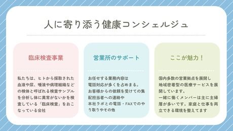 仕事内容 【未経験からでも始めることができる事務作業】 ▼仕事内容 ▽デスクワーク業務 ・営業所内事務作業 ・データ入力 ・電話対応 ・ファックス対応 ・検査結果報告書仕分け ・検査依頼データ取込作業 (パソコンを使用して、USBにデータを落とす作業) ※勤務する時間帯によって担当する業務内容は異なります ▼よくある問い合わせ内容 ▽医療機関 ・検査物の集荷依頼 ・検査内容の追加依頼 ・検査結果に関する問い合わせ ▽その他 ・各拠点の授業員対応 ・本部から問い合わせ対応 【業務マニュアルがあるので安心】【従業員のサポート体制◎】[福利厚生充実] ▼仕事の特徴 ・業務マニュアル有 ・新人向けの研修有 ・チームで協力しながら業務を行う体制 ▼授業員の特徴 ・初心者からベテランまで幅広いスタッフが活躍 ・協調性のあるスタッフが多い ・業務はチーム皆で協力する体制 ・幅広い年齢層の方活躍中 ▼福利厚生 ・交通費支給 ・社会保険・雇用保険加入有 ・自転車通勤可 ・服装自由 ・有休付与 【働いている従業員の声】 ▼電話対応業務を担当している方の声 ☆【3年目事務職未経験者】 ☆【7年目事務職経験者】 ▽どのくらいで慣れました? ・週3日の午前中働いているが入社1カ月ぐらいでは業務に慣れることができた ・週4日のフルタイム勤務で入社3週間くらいで業務に慣れることができた ▽やっていてよかったこと ・検査の知識などが入ってきた ・中性脂肪などの検査項目が入ることによって自身の健康にも役に立つ ・一緒に働く従業員がとても良い ・風通しのよい職場環境がある 国内に多数の営業拠点を展開する「保健科学研究所」。 臨床検査事業を主軸に、長年医療現場や生命科学の発展に寄与。 環境検査,健診事業、介護事業など、保健科学に関する幅広い事業を展開しています。 「医療業界のお仕事は専門知識がないと働けない」と思った方! 当社の事務職では未経験者大歓迎です。 皆さまのご応募お待ちしております。