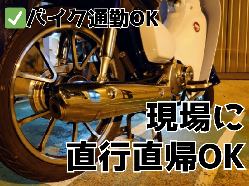 職場環境 現在活躍中のスタッフは 40代~60代が中心。 中には5年以上勤務している方もいます。 バイク通勤OK、喫煙所あり。 防寒着などの貸与制度もあり、 屋外でも安心して働ける体制です。 喫煙所:喫煙所あり(屋外)