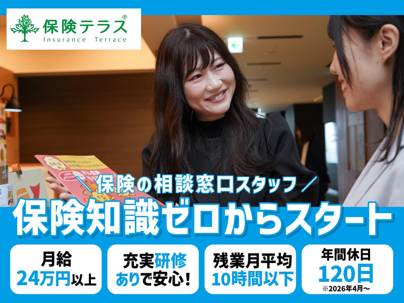 仕事内容 \別業界・別職種出身者が活躍中/ メインで活躍している20代、30代の社員は、保険業界未経験からスタートした人も多数います。育成専門のチームがあり、半年~1年で保険のプロへの道をサポートします!残業は少なく、転居を伴う転勤は基本なし!地元/出身地など希望エリアで長くお仕事をしたい方大歓迎です!! 【POINT】 *インセンティブ年4回 *残業月平均10h以下 *役職・住宅手当、資格取得支援 *月9日休み※希望考慮 *産休・育休制度/取得実績あり *短時間勤務制度 *年間休日120日 ※26年4月~ 【仕事内容】 来店型保険ショップ「保険テラス」にて、お客様の保険に関する疑問や悩みに対応するお仕事。 ~具体的には~ 保険やお金に関する将来の不安や相談事を伺い、必要に応じてお客様に合った保険商品のご説明をします。契約となりましたら、手続き業務を行います。 ▼お客様のお悩みをヒアリング ご相談内容によって30社以上ある保険会社の商品から、お客様にピッタリの商品を提案・営業します。店舗ごとに各保険会社の担当がついているので、新商品の説明や不明点の問合せなどもスムーズです。 ▼お客様のニーズは人それぞれ ニーズに合った商品をご提案できるよう、じっくりお話して頂きます。 ※1回の接客は平均2時間。 ※成約率は平均6割!ご満足頂いています♪ ▼現在新人向けの初期研修では、入社後8か月間の当社独自の育成プログラムを実施。 座学で商品知識や来店時の初期対応・ヒアリング方法等 基礎知識を学んでいただきます。 また、配属先の店舗にて先輩社員に同席してご提案に必要なレポートを作成したり、 申込対応など、より実践的なスキルを身に着けていただきます。 入社後4~5ヶ月目には同期全員が本社に集まりロープレ発表を行い、 研修担当者からFBをもらう機会も設けています。 しっかりと体系化された研修があるのも、未経験から活躍できる理由です。