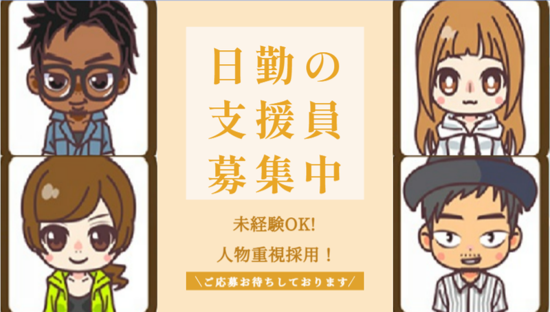 求めている人材 「少し話を聞いてから応募を考えたい」という方も、遠慮せずご連絡ください。 「ブランクがあって履歴書が書きづらい・・・」 「ずっとアルバイトしかしていない・・・」 そんな方も是非勇気をもって応募してみてください。 経験よりも人柄を重視した採用を行います。 「障がい福祉の分野のお仕事?」「就労支援?」「どんなことするの?」等、 そんな不安がある方はぜひ職場見学にお越しください! 【必須条件】 ◆普通自動車免許(AT限定可) ペーパードライバーでない方 【歓迎条件】 ◆介護職の経験をお持ちの方 ◆介護福祉士の資格をお持ちの方 ◆介護ヘルパーの経験をお持ちの方 ◆未経験OK ◆無資格OK ◆年齢不問
