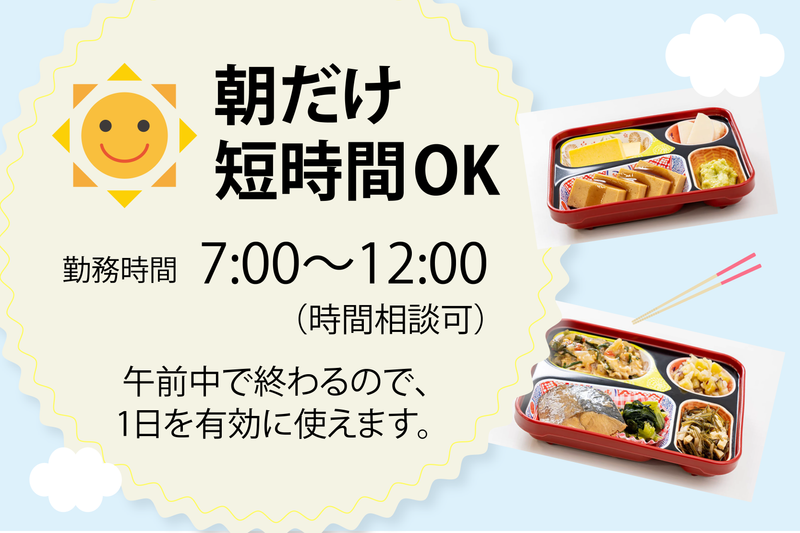 勤務時間詳細 6:30~9:00 7:00~11:00 9:00~11:30 6:30~11:30 *午前のみ募集中! *週1日から・1日2時間~相談OK。 週5日勤務大歓迎 *基本的に残業なし! 家事や趣味と両立可能! ガッツリフルタイム、レギュラー勤務もOK!