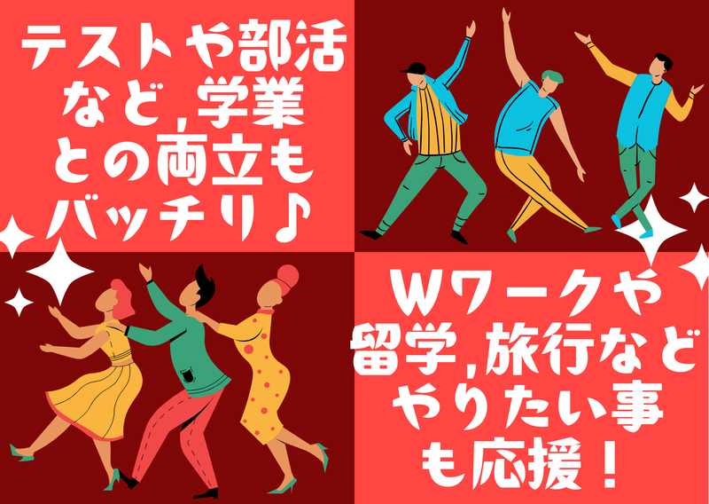 シフト制 勤務時間詳細 10:00~22:00 *週2日~、1日2時間~OK *学校の日程が決まってからも シフト調整可能◎ *「平日夜のみ」「土日祝のみ」OK