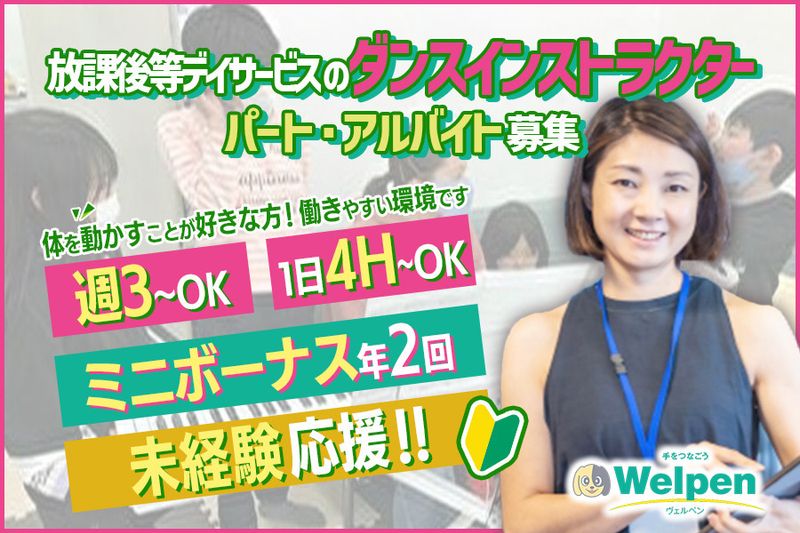 【雇用形態】 アルバイト・パート 【契約期間】 試用期間3カ月(同条件)。その後、パートアルバイトのため契約条件による 【その他】 #普通自動車免許(AT限定可) #未経験者歓迎 #フリーター歓迎 #主婦・主夫歓迎 #ブランクOK #経験者歓迎 #有資格者歓迎 #40代以上応募可 #50代以上応募可 #60代以上応募可 #学歴不問 【ハローワークへの求人掲載について】 弊社の求人はハローワークに掲載していない案件が多数ございます。(ハローワーク求人掲載は期間が経つと自動的に掲載が止まるため)ハローワーク経由でお仕事を探している方はお問い合わせ頂ければハローワークにて求人を掲載し、そこから応募して頂く場合もございます。お気軽にお問い合わせください。 【このような方活躍】 障がい児へのダンス指導者(ダンス、ダンス指導、ダンスインストラクター、ダンス講師、ダンススタッフ、放課後等デイサービス)で未経験から働きたい方。ダンス指導者やダンスインストラクター経験者の方。週3日~、扶養内勤務、副業・WワークOK、ミニボーナスありのダンス指導者として働きたい方。未経験、ブランクOK、主婦主夫、中高年、シニア層も活躍している職場で働きたい方。ダンス指導者としてパート・アルバイトで働きたい方。ダンス指導者を新着急募。ダンス指導者、インストラクター、放課後デイサービス、発達支援、インストラクター。