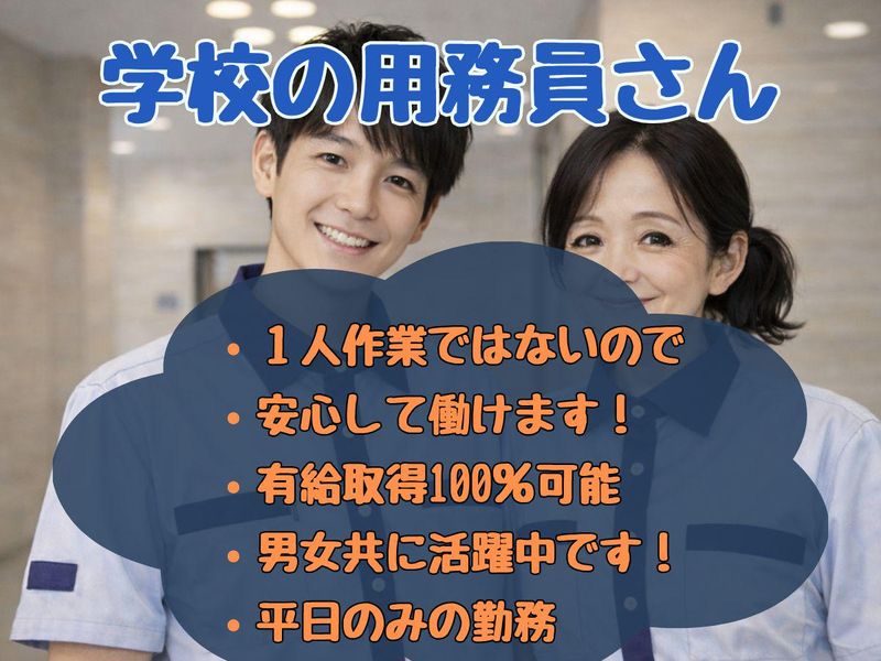 仕事内容 <仕事内容> 横浜市立市場中学校にて、 校内の清掃・簡単な点検・巡回業務をお任せします。 具体的には… ・教室、廊下、階段、トイレなどの清掃 ・校内を巡回し「壊れていそうな所はないか」のチェック ・危険箇所があれば報告(専門作業はありません) ★マニュアル完備&先輩スタッフが丁寧にフォロー ★子どもたちの元気な声が聞こえる、明るい職場です ★学校の運営を裏方で支える貢献度の高いお仕事です <ポイント> ✔ 未経験スタートがほとんど ✔ 力仕事なし/体への負担少なめ ✔ 固定勤務地で落ち着いて働ける ✔ 社会貢献度の高い公共施設のお仕事 ✔ 定年後活躍しているスタッフ多数活躍中