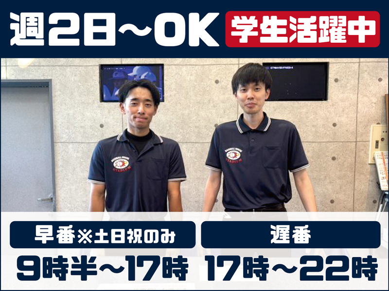 仕事内容 \\学生活躍中!バイトデビュー応援!!// *週2日~OK/「土日だけ」「平日だけ」も可* 授業・サークル・テスト期間など柔軟に対応! >> スポーツ・野球好きさんも必見!! << 「学校で野球をしてる」「スポーツ観戦が好き」 という方はもちろん、 「小さい頃はよく親とキャッチボールしてた」 「正直ルールは詳しくないけど楽しそうだから 働いてみたい」 という方まで大歓迎です!! 私たちと一緒に、バッティングセンターを 盛り上げていきませんか? =・=・=・=・=・=・=・=・=・= 【仕事内容】 バッティングセンターでの 受付・接客業務をお願いします。 [具体的には…] ・ご来店されたお客様の受付対応 ・料金・施設のご案内、遊び方の説明 ・お電話でのお問い合わせ対応 など =・=・=・=・=・=・=・=・=・= 《2名体制だから未経験でも安心!》 接客が初めての方やアルバイトデビューの方 も、ゼロから丁寧に教えます! 基本的に2名体制で業務を行っているので、 「1人に全部お任せ!」なんてことは ありませんので安心して続けられます! 《野球のルールが分からなくても大丈夫》 実際に、「野球のルールはそこまで詳しく ないけど、施設の雰囲気が好きで楽しく 働ける!」というスタッフも! スポーツが好きな方はもちろん、あまり 詳しくないという方でもご応募OKです! 《シフト相談はお気軽に!》 時間や日数は柔軟に対応しています。 今活躍中の大学生も、 学校の授業やテスト、部活・サークル、 プライベートの予定とバッチリ両立 しています! =・=・=・=・=・=・=・=・=・= 【ベースボールハウススタジアム】 小さなお子様からシニアの方まで、 幅広い世代の方に愛される施設! 本格的なバッティング練習はもちろん、 日々のストレスを解消したい人など、 子どもから大人までたくさんのお客様で 毎日ワイワイ賑わっています! HP:https://www.sports-form.com/
