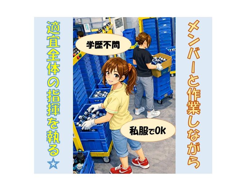 仕事内容 ⋄✧⋄⋆⋅⋆⋄✧⋄⋆⋅⋆⋄✧⋄⋆⋅⋆⋄✧⋄ \週4日~×平日のみ!/ 清涼飲料水の仕分けスタッフ ☆リーダー候補を募集中☆ ⋄✧⋄⋆⋅⋆⋄✧⋄⋆⋅⋆⋄✧⋄⋆⋅⋆⋄✧⋄ \腰の負担もナシ♪/ 倉庫内での清涼飲料水の仕分け・ ピッキング作業をお願いします。 ペットボトル飲料を1本ずつ専用の箱に入れるだけ! 高さ調整のできる台車があるので、 腰への負担も心配ありません◎ 今回は上記に加えて、リーダー業務を お任せします!メンバーと同様に 上記の仕分け/ピッキング作業を 行いながら、当社メンバー全体への指示出し(作業の割り振り・声かけ等)をお願いします。 男性・女性ともに活躍中! 繰り返し作業が中心なので、未経験の方でも すぐ慣れていただけます★ 学生さん・主婦さん・シニアの方も活躍中✨ 幅広い世代が働きやすい職場です♪ 「コツコツ作業が好き」 そんな方にピッタリのお仕事です◎ ◆1日の流れ(リーダー業務あり)  ̄ ̄ ̄ ̄ ̄ ̄ ̄ ̄ ̄ ̄ ̄ ̄ ̄ ̄ ̄ 出社して勤務開始 (天候に左右されない屋内作業) ↓ 当日の作業内容を確認し、 当社メンバーへ指示出し ↓ 飲料水を1本ずつ箱詰め (台車ありで安心♪) ※リーダーも作業に入りながら全体の進捗をチェック ↓ お昼休憩 ↓ 午後の作業スタート (進み具合を見て声かけ・調整・フォロー) ↓ 作業終了!片付け・最終確認/翌日の準備共有 (残業ほぼなし) ◆勤務条件  ̄ ̄ ̄ ̄ ̄ ̄ ・8:30~17:30(実働8時間/休憩60分) ・平日のみ ・週4日以上 ・残業基本なし◎ ・バイク通勤OK!✨ ◆給与  ̄ ̄ ̄ ̄ 時給1450円~(別途交通費支給) \こんな方にピッタリ✨/ ✅ コツコツ作業が得意な方 ✅ 平日のみ働きたい方 ✅ 腰への負担が少ない軽作業を 探している方 ✅ 未経験から安心して始めたい方 ◆会社について  ̄ ̄ ̄ ̄ ̄ ̄ ̄ ̄ 当社は創業60年以上のマルノウチグループの一員。 大手飲料メーカーとの取引をはじめ、 300名を超えるスタッフが活躍中です。 「ここで働いていてよかった」 と思っていただけるように、 安心して働ける環境づくりに力を入れています。 気になった方はぜひお気軽にご応募ください♪ あなたと一緒に働ける日を楽しみにしています◎