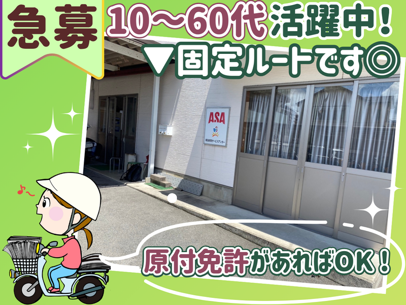 求めている人材 【 必須 】 要原付免許 ⭐未経験歓迎! ⭐年齢不問 ⭐10~60代の幅広い世代が活躍中! ⭐学生・フリーター・主婦(夫)歓迎 ⭐60代シニア応援 ⭐Wワーク・副業OK ⭐扶養内勤務OK