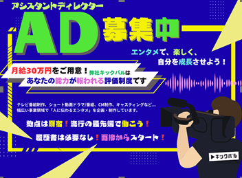 求めている人材 ⭐【経験者優遇】⭐ テレビ・配信・SNSなど、映像制作の現場でAD・制作進行・編集経験がある方。 あなたの“現場経験”が、次のステージで輝くタイミングです。 20代のフリーランス動画編集者へ 編集ソフトを使いこなして、 YouTubeや企業案件で稼いできた。 でも、最近気づいたはずだ。 「編集だけじゃ、伸びしろに限界がある」って。 案件単価を上げたいなら、 次は“企画とキャスティング”ができなきゃダメだ。 自分で企画を立てて、 誰を出して、どんなトーンで撮るかを設計できる人。 それがディレクター。 キックバルでは、ADでも 企画出し・構成打ち合わせに参加できる。 演者との関わりもある。 “編集者”で終わらない映像人になれる。 フリーで得たスキルを、 「組織の中でスケールさせる経験」っていうのは、 思ってる以上に貴重だ。 「個の力」を「チームの力」に変えられる人。 それが次のステージのディレクター像。 ●求めているのは、“エンタメを信じ続ける人” テレビはオワコン? いや、全然。 AIが進化すればするほど、 人間は「面白いもの」「感情を動かすもの」に戻ってくる。 AIが台本を作っても、 それを“人が感じる形”に演出できる人は限られている。 あなたがこれまで現場で感じた「間」や「空気」は、 AIには一生真似できない。 これからの時代、 “動画を作る人”と“世界を動かす映像人”の差が広がる。 その分かれ道に、 キックバルは立っている。 ✅ 企画脳を持つAD 現場だけでなく「何を伝えたいか」から考えられる人。 打ち合わせ中に「それ、面白いっすね!」って言える感性。 ✅ 構成・編集を理解する人 PremiereでもDaVinciでもいい。 “どう切れば伝わるか”を考えられる頭がほしい。 ✅ キャスティング力がある人 人の魅力を引き出せる観察眼。 タレントもスタッフも“人間”として動かせる人。 ✅ ネットノリを理解してる人 TikTok・YouTubeのテンポ感、 “今ウケる空気”を肌で感じてる人。 ✅ お笑いが好きな人 笑いの“間”をわかってる人。 真面目な話をふざけながら伝えられるセンス 年齢の条件と理由:あり(例外事由3号のイ・30歳未満(長期勤続によるキャリア形成のため))