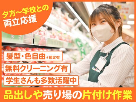仕事内容 年齢不問・バイトデビューも歓迎! 未経験OK!スーパーの青果部門での、簡単コツコツ作業です。 「初めてのバイトでも安心だった!」という声、たくさん♪ 【お仕事内容】 制服に着替えたら、今日の作業スタート! 商品を棚にキレイに並べる お買い得シールをペタッと貼る 売場を見ながら、在庫の確認や整理 その他、簡単なサポート業務 など 最初は研修で作業の流れをしっかりレクチャー。 慣れてくると「この商品の鮮度、見分けられるようになってきた!」なんて実感も。 軽作業中心なので、初めてでも始めやすい内容です◎ 【うれしいPOINT】 ・シフト相談・扶養内もOK!家庭やプライベートと両立◎ ・ 髪型・髪色自由/ネイルやピアスもOK♪(規定あり) ・ バイク・自転車通勤OK/交通費支給あり(規定) ・ 休憩室・ロッカー・更衣室完備!働きやすい設備が充実♪ 【こんな方におすすめ】 ◇初めてのアルバイト・パートを探している方 ◇ コツコツ作業が好きな方 ◇ 学生・フリーター・中高年・シニアまでどなたでも歓迎! 【スタッフの声】 「かたいかぼちゃも専用のカッターでスパッと切って、 ラップを巻いたりといった簡単な作業なので安心でした。 周りのスタッフも優しくて、シフトの相談も気軽にできるので長く続けられています!」 \職場の“裏側”ものぞけちゃう!?/ 普段はなかなか見られない、スーパーのバックヤード。 実は設備がキレイで働きやすいんです! - 【当店のココが働きやすい!】 ★定期的な店舗改装で設備が新しい! 古くなったお店は更地にして、新しく再建。 売場だけでなく、バックヤードの清潔感にも自信あり◎ ★休憩室も快適♪ 冷蔵庫・電子レンジに加えて、価格が安い自販機も設置! ★社員の多さ=安心感! 店長・副店長に加えて、各部門に責任者+社員が在籍。 「困ったときは誰に聞けばいいか」が明確で、バイト初心者でも安心して働けます◎ ★相談しやすいシフト体制 シフトや仕事内容の相談も、担当部門の責任者に気軽にできる環境。 だからこそ、長く働いているスタッフが多いんです♪ 【チームワークも抜群!】 店内は広く、商品数も多いからこそ「チームワーク」がとても大事。 写真撮影のときも、照れながらも協力してくれる優しい先輩たちばかり! 人間関係の良さ・居心地の良さは、ぜひ見てほしいポイントです。 「ここにしてよかった!」と思える職場です。 初めての方にも自信を持っておすすめできる、安心&快適な環境が整っています!