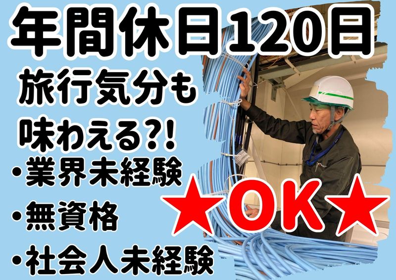 仕事内容 *出張中は旅行気分も味わえる?! *東海3県がメインのお仕事です *未経験からの入社がほとんど! 全て屋内での現場作業! 学歴・経験不問◎社会人経験ない方も大歓迎! 東海エリアで電気通信工事! <お仕事詳細> 大手通信会社様の電話基地局内の機械室で 通信機器の設置・撤去、配線などのお仕事です。 ※現場は愛知県・岐阜県・静岡県になります。 【具体的には】 大手通信会社様の機械室で、指定された機械を 順にラックに並べ、新しい配線に差し替え・ 古いものは撤去していきます。 作業内容は幅広く、簡単なものから長期間かけて行なう 大がかりな工事など様々です。 長期間の工事の場合、お休みの日は現地で観光もできるので、 旅行気分で県外にいく事もできます◎ 実際に保険営業やゲームセンターの店長など、 様々な前職の方が活躍中! 働き方も、気持ちも、のびのびできる仕事が待っています。 分からない用語や記号があって当たり前です。 一緒に一から覚えて行きましょう! <先輩方について> ~他業種からの転職、中途入社の先輩多数活躍中~ アパレル業界ので接客・販売、福祉業界での介護スタッフなど異業種から転職した方がほとんど! 未経験でも自分に合った働き方で仕事を覚える事ができるので、 キャリアアップしてグループ長としてメンバーの中心となって働く事も可能です。 まずは現場見学をして自分に合うか知りたい!という方ももちろんOKです! あなたのライフステージ・ペースに合わせて、 柔軟に働ける環境です◎