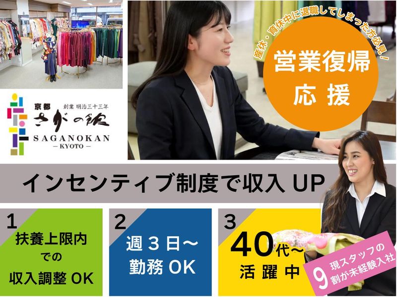 仕事内容 ==================== 「営業職」×「パート」という働き方 高額インセンティブ制度で収入UPを応援! ==================== ✅未経験スタートでも時給1200円~ ✅主婦さん・フリーター活躍中! 産休・育休中に退職した方の仕事復帰にも◎ ✅関西最大級のコレクション参加実績あり ブランド力&知名度抜群 ✅週3日〜OK/正社員同様、週5日も◎ ✅駅チカで通勤楽々♪交通費規定支給 ✅研修・マニュアル・サポート体制充実 ✅新上限「年間123万円以内」での調整可 >>CHECK! インセンと仕事の楽しさはそのままに 管理業務や数字などの面倒事はポイッ! アルバイト・パートだからこその 気軽さのなかで働けます! ==================== 「安定性」「ブランド力」「知名度」 三拍子そろった実力派企業で営業職復帰!  ̄ ̄ ̄ ̄ ̄ ̄ ̄ ̄ ̄ ̄ ̄ ̄ ̄ ̄ ̄ ̄ ̄ ̄ ̄ ✨お任せする業務内容✨  ̄ ̄V ̄ ̄ ̄ ̄ ̄ ̄ ̄ ̄ ̄ <サロンでの接客・提案営業業務> *来店受付、電話応対、メール対応等 *ヒアリング、プラン提案 *コーディネート提案、相談含む接客 *店舗清掃など <式典当日・前撮り時> *来店受付 *予約プランの確認、事務作業 (書類の作成、コピー、契約内容の確認) *着付け補助・準備のお手伝い *お会計 振袖・袴のコーディネート提案や プランニング、接客を担当するお仕事です! 晴れの日の衣装提案をあなたが担当♪ 選んだ着物に合うメイクやアクセサリーの 提案も行えます♪ <ここがポイント>・・・・・・・・・・・・・・・・・・・・・ 繁忙期は式典本番を迎える1月~3月です。 店舗スタッフとして、着付け補助業務など で大変になりますが、4月~10月までは、 契約に向けた着物・袴のコーディネート 提案やプラン提案など接客・営業業務 メインとなります♪ ・・・・・・・・・・・・・・・・・・・・・・・・・・・・・・・・・・・・・・・ ✨こんな働き方が可能です  ̄ ̄V ̄ ̄ ̄ ̄ ̄ ̄ ̄ ̄ ̄ ̄ 「週の半分くらいの勤務がいいな」 ▼ 土日含む週3日~勤務OK! 勤務曜日の固定も可能です。 「日曜日は保育園がお休みなので、 土曜日なら出勤できます!」などの ご事情も配慮◎ 「朝は家事や子供の見送りでバタバタ」 ▼ 10時始業なのでお子さんの送りも◎ 勤務時は黒パンツ×Yシャツスタイルで 固定なので洋服選びも困りません♪ 今日はお化粧に時間がかけれなかった… そんなときはマスクをつけて接客もOK 「働く日はしっかり集中して働きたい」 ▼ 基本的には1日8時間のフルタイム勤務を お願いしていますが、 「扶養控除内に収めたい!」 「扶養の上限ギリギリで調整したい!」 のご要望にもお応えいたします♪ 扶養内に収めるために… ⭐1日1時間程度短い勤務OK(実働7時間) ⭐上限内での勤務日数・勤務時間調整 お気軽にご相談ください ==================== ✨職場の雰囲気  ̄ ̄V ̄ ̄ ̄ ̄ ̄ ̄ ̄ ̄ ̄ ̄ 子育てが落ち着いた40代の 主婦スタッフさんや、未就学児の育児に 奮闘中の30代ママさんスタッフが活躍中! 結婚から子育てのブランクを経て 活躍されている方が多いので 家事・育児と仕事の両立に 理解のある職場です♪ ✨9割以上が未経験スタート  ̄ ̄V ̄ ̄ ̄ ̄ ̄ ̄ ̄ ̄ ̄ ̄ ̄ マニュアルや研修が充実! まずは簡単なお仕事からお願いします <充実の研修をご用意>――――――――― 着付けの基本/着物の構造について (長襦袢、帯、帯揚げ、帯締めなど) メンテナンス・管理方法(着物の畳み方等) ―――――――――――――――――――― 仕事を通じて自然と覚えていただけます。 ==================== < 会社について > ✨関西で卒業式袴レンタル13年連続No.1✨ (大学生協調べ) アンジュを運営する「株式会社京繊」は 明治33年創業と120年もの歴史を誇ります。 近年は有名芸能人や インフルエンサーを広告塔に起用したり、 大規模ファッションショーへの参加など、 和装業界のイメージを一新する メディアマーケティングを展開中です。 ・・・・・・・・・・・・・・・・・・・・・・・・・・・・・・・・・・・・・・・