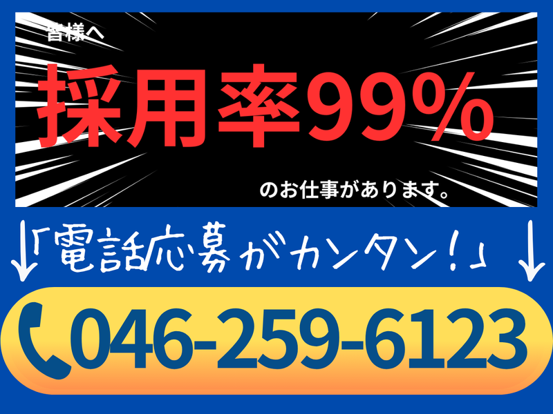 選考プロセス 【面接について】 来社不要!電話面接のみでもOK! 対面希望の方ももちろん大歓迎! 【電話応募の方】 「現場作業の求人を見た」と伝えてください。 【問い合わせ電話番号】 046-259-6123 【WEB応募の方】 応募ボタンより 必要事項を入力の上、送信してください。 こちらよりメール、もしくはお電話にてご連絡します!